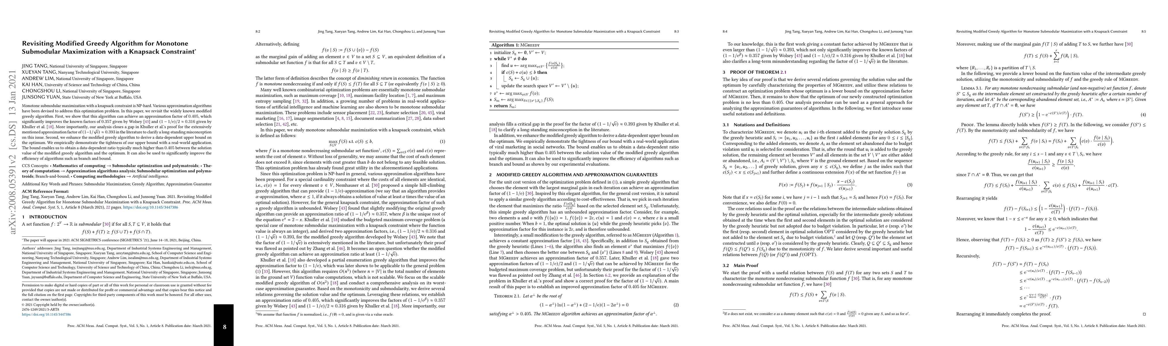 Researchers revisit a modified greedy algorithm for solving an NP-hard optimization problem with a knapsack constraint, achieving improved approximation factors and deriving a data-dependent upper bound that enhances algorithm efficiency.