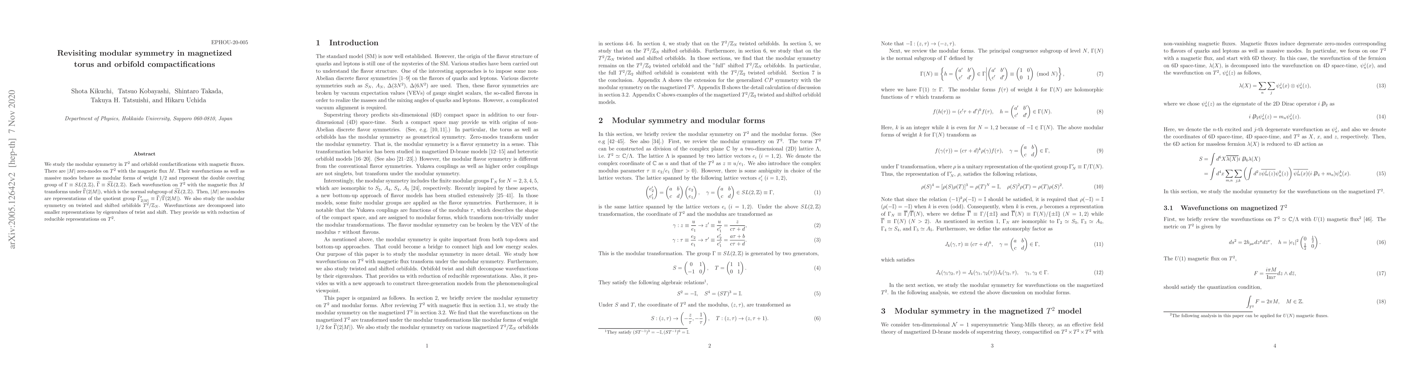 This research revisits modular symmetry in toroidal and orbifold compactifications with magnetic fluxes, revealing zero-mode wavefunctions on $T^2$ that transform under $\widetilde{\Gamma}(2|M|)$ and represent quotient groups. Additionally, it examines the modular symmetry in twisted and shifted orbifolds, where wavefunctions decompose into smaller representations.