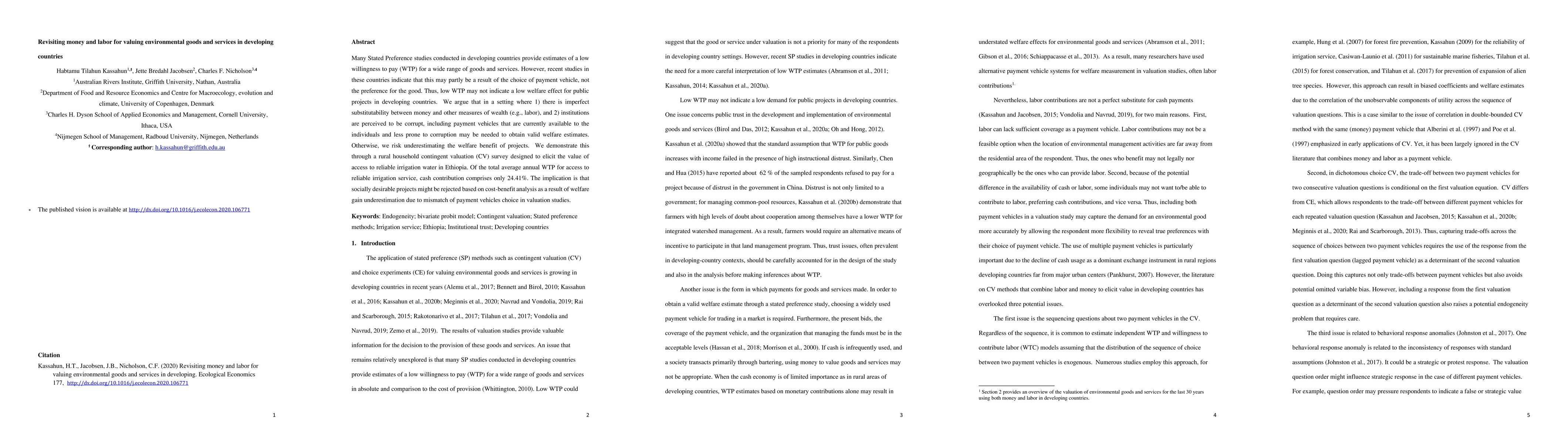 This research argues that low willingness to pay (WTP) for environmental goods and services in developing countries might stem from the choice of payment vehicle, not actual preference. Using a rural Ethiopian irrigation water valuation study, it found cash contributions accounted for only 24.41% of total WTP, suggesting that mismatched payment vehicles in valuation studies could underestimate welfare benefits and lead to rejection of beneficial projects based on cost-benefit analysis.