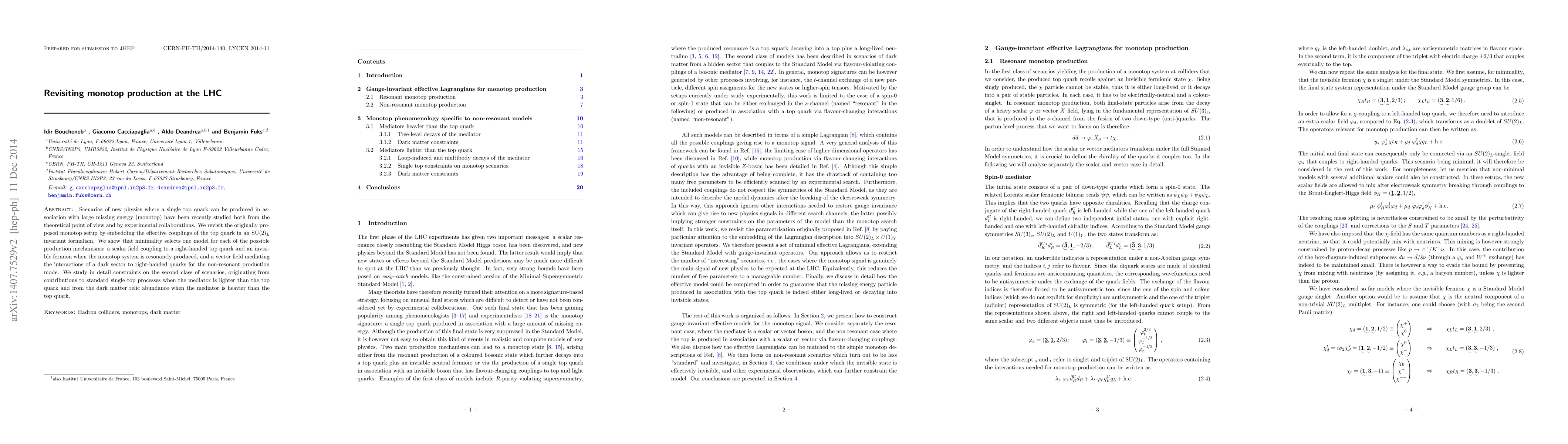 Scenarios of new physics where a single top quark can be produced in association with large missing energy (monotop) have been recently studied both from the theoretical point of view and by experimental collaborations. We revisit the originally proposed monotop setup by embedding the effective couplings of the top quark in an SU(2)L invariant formalism. We show that minimality selects one model for each of the possible production mechanisms: a scalar field coupling to a right-handed top quark and an invisible fermion when the monotop system is resonantly produced, and a vector field mediating the interactions of a dark sector to right-handed quarks for the non-resonant production mode. We study in detail constraints on the second class of scenarios, originating from contributions to standard single top processes when the mediator is lighter than the top quark and from the dark matter relic abundance when the mediator is heavier than the top quark.