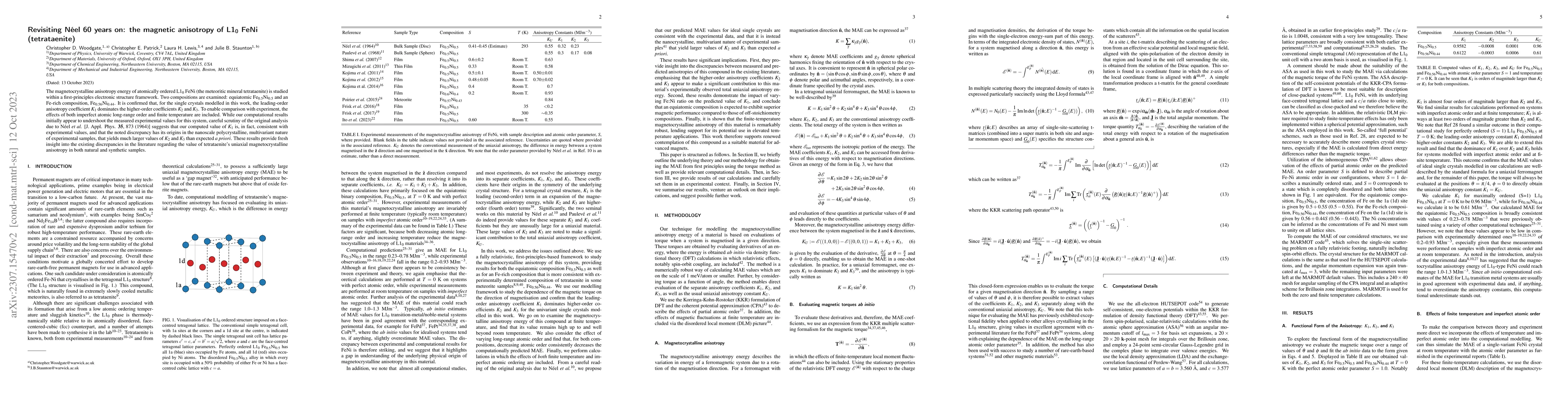 This study revisits the magnetic anisotropy of $\mathrm{L}1_0$ FeNi (tetrataenite) using first-principles calculations, confirming that the leading-order anisotropy coefficient $K_1$ dominates. The analysis reconciles computational discrepancies with experimental data, attributing differences to the nanoscale polycrystalline nature of experimental samples.