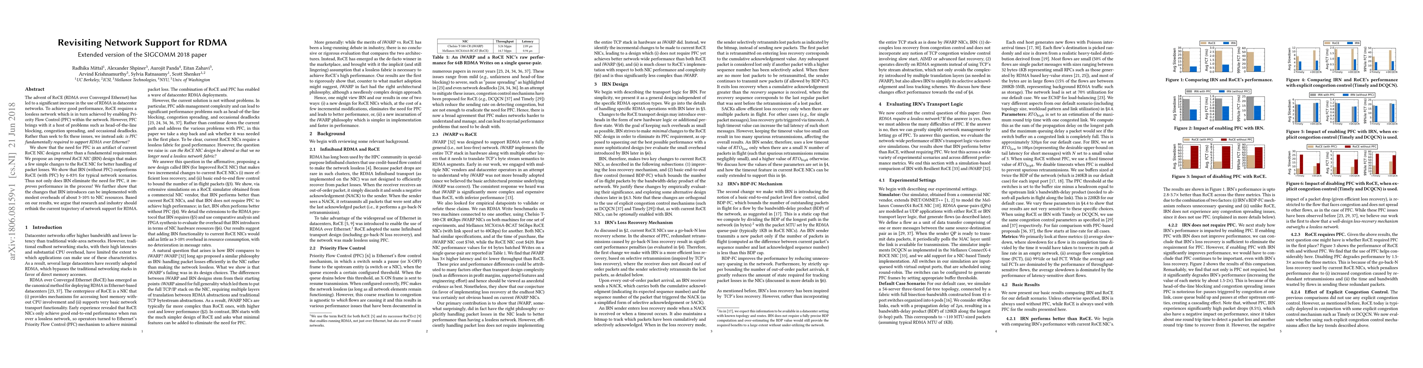 This paper argues that Priority Flow Control (PFC) is not fundamentally required for RDMA over Ethernet (RoCE) and proposes an improved RoCE NIC (IRN) design that eliminates PFC while achieving 6-83% better performance. The IRN design incurs modest overheads of 3-10% to NIC resources, suggesting a need for rethinking current network support for RDMA.