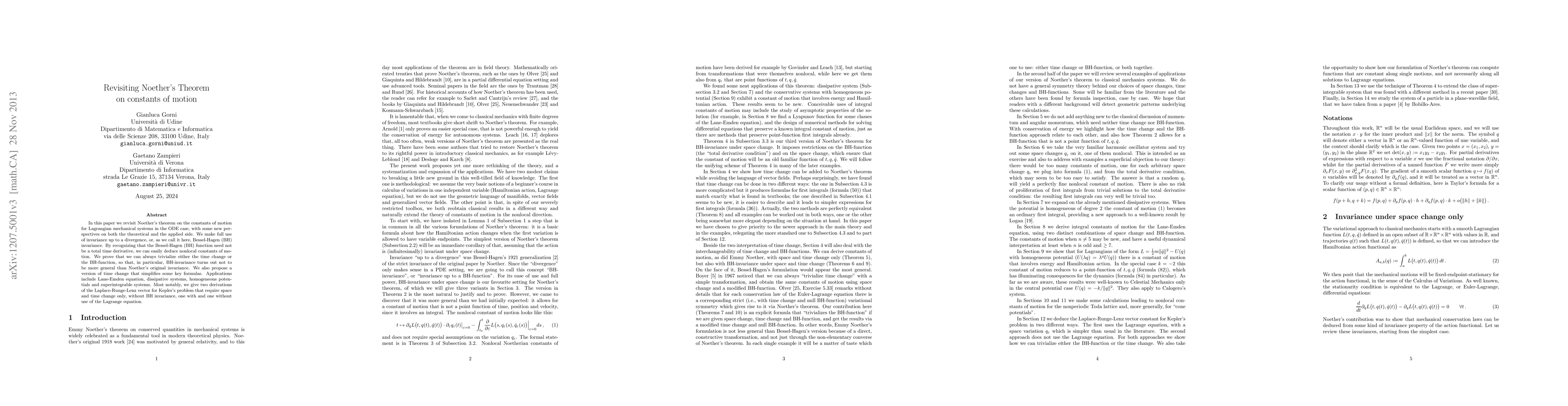 This paper revisits Noether's theorem to explore constants of motion in Lagrangian systems, introducing Bessel-Hagen (BH) invariance and demonstrating nonlocal constants of motion. It concludes that BH-invariance is not more general than Noether's original theorem and provides simplified time change versions, with applications to various systems including Kepler's problem.