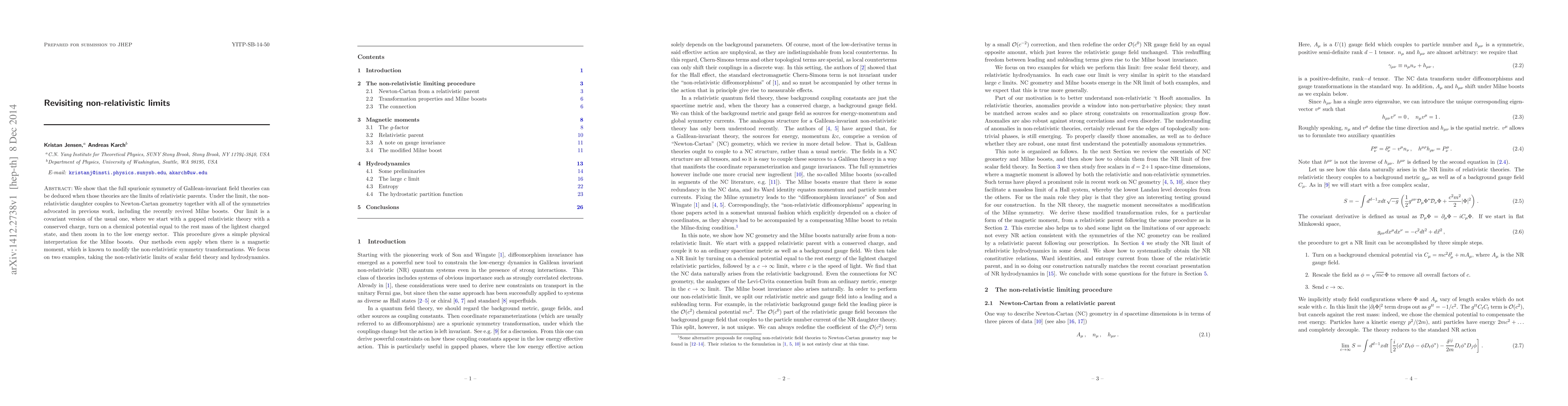 We show that the full spurionic symmetry of Galilean-invariant field theories can be deduced when those theories are the limits of relativistic parents. Under the limit, the non-relativistic daughter couples to Newton-Cartan geometry together with all of the symmetries advocated in previous work, including the recently revived Milne boosts. Our limit is a covariant version of the usual one, where we start with a gapped relativistic theory with a conserved charge, turn on a chemical potential equal to the rest mass of the lightest charged state, and then zoom in to the low energy sector. This procedure gives a simple physical interpretation for the Milne boosts. Our methods even apply when there is a magnetic moment, which is known to modify the non-relativistic symmetry transformations. We focus on two examples, taking the non-relativistic limits of scalar field theory and hydrodynamics.