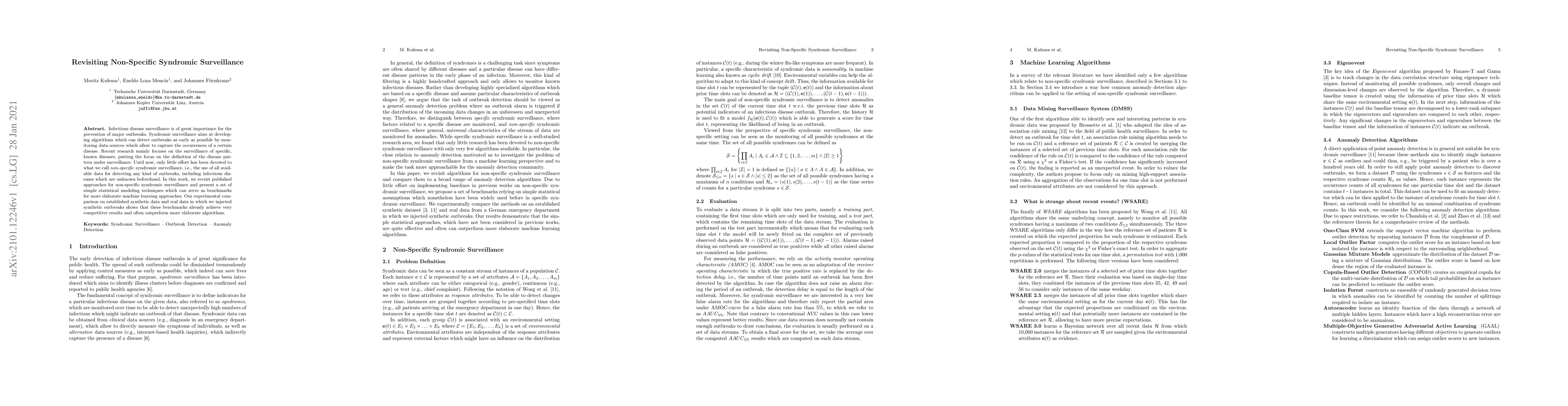 Infectious disease surveillance is of great importance for the prevention of major outbreaks. Syndromic surveillance aims at developing algorithms which can detect outbreaks as early as possible by monitoring data sources which allow to capture the occurrences of a certain disease. Recent research mainly focuses on the surveillance of specific, known diseases, putting the focus on the definition of the disease pattern under surveillance. Until now, only little effort has been devoted to what we call non-specific syndromic surveillance, i.e., the use of all available data for detecting any kind of outbreaks, including infectious diseases which are unknown beforehand. In this work, we revisit published approaches for non-specific syndromic surveillance and present a set of simple statistical modeling techniques which can serve as benchmarks for more elaborate machine learning approaches. Our experimental comparison on established synthetic data and real data in which we injected synthetic outbreaks shows that these benchmarks already achieve very competitive results and often outperform more elaborate algorithms.