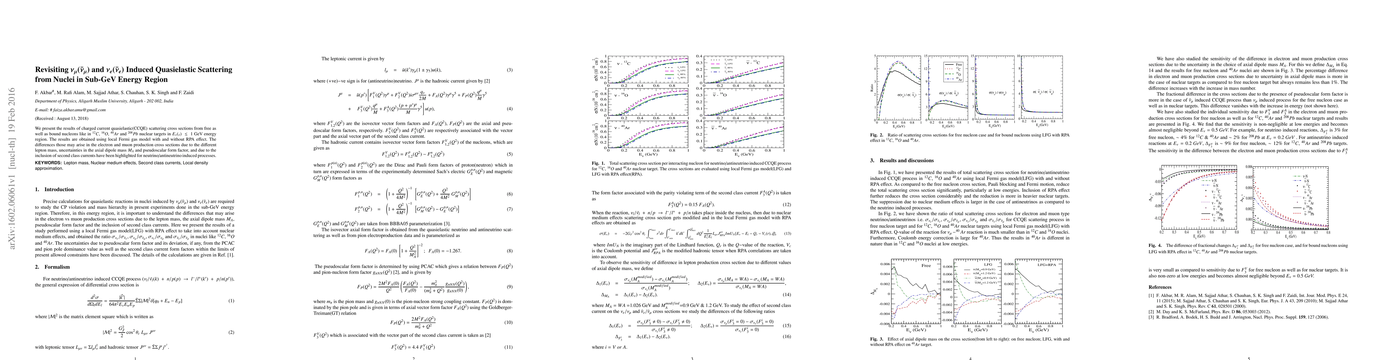 We present the results of charged current quasielastic(CCQE) scattering cross sections from free as well as bound nucleons like in $^{12}C$, $^{16}O$, $^{40}Ar$ and $^{208}Pb$ nuclear targets in $E_\nu(_{\bar\nu})~\le~ $1 GeV energy region. The results are obtained using local Fermi gas model with and without RPA effect. The differences those may arise in the electron and muon production cross sections due to the different lepton mass, uncertainties in the axial dipole mass $M_A$ and pseudoscalar form factor, and due to the inclusion of second class currents have been highlighted for neutrino/antineutrino induced processes.