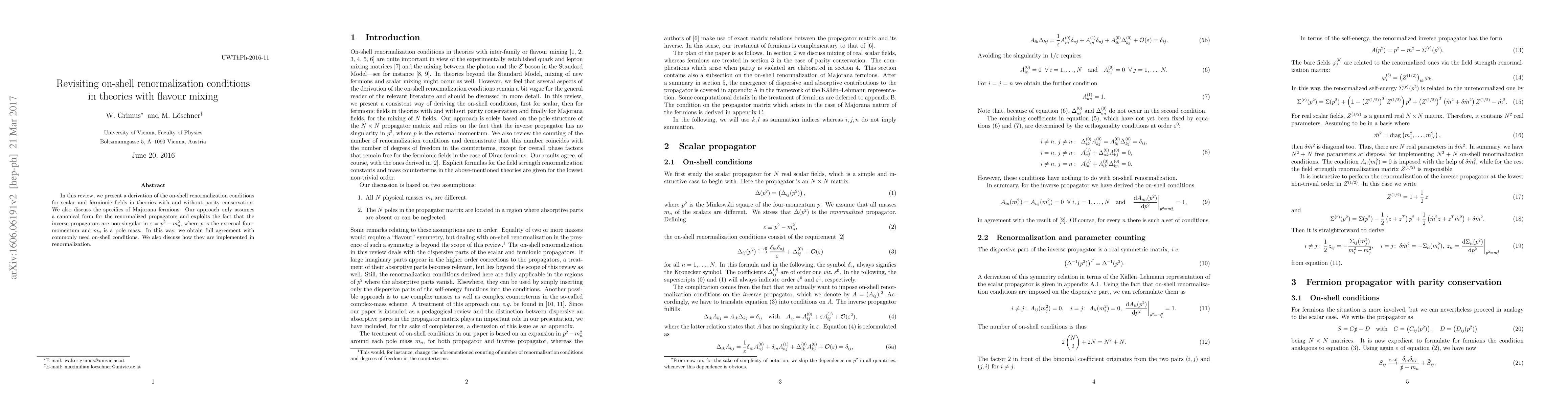 This paper derives on-shell renormalization conditions for scalar and fermionic fields in theories with flavor mixing, focusing on both parity-conserving and non-conserving scenarios, and highlights the unique aspects of Majorana fermions. The approach ensures consistency with standard on-shell conditions by assuming a canonical form for renormalized propagators.