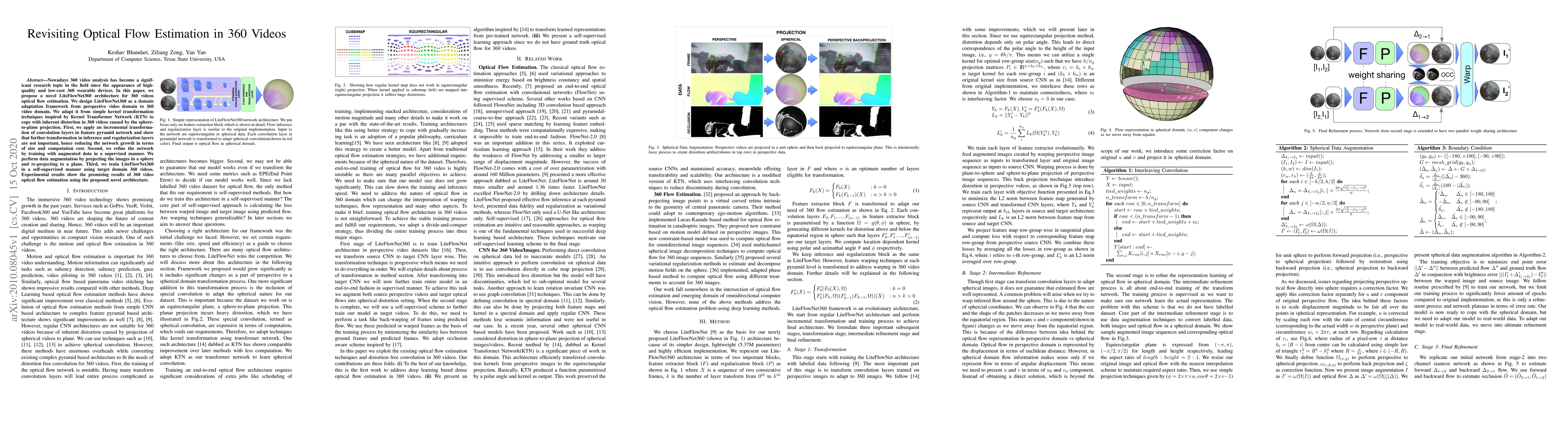 This paper proposes a LiteFlowNet360 architecture for optical flow estimation in 360 videos, adapting it from perspective video domain using domain adaptation techniques. The architecture reduces size and computational cost while achieving promising results through data augmentation and self-supervised training.
