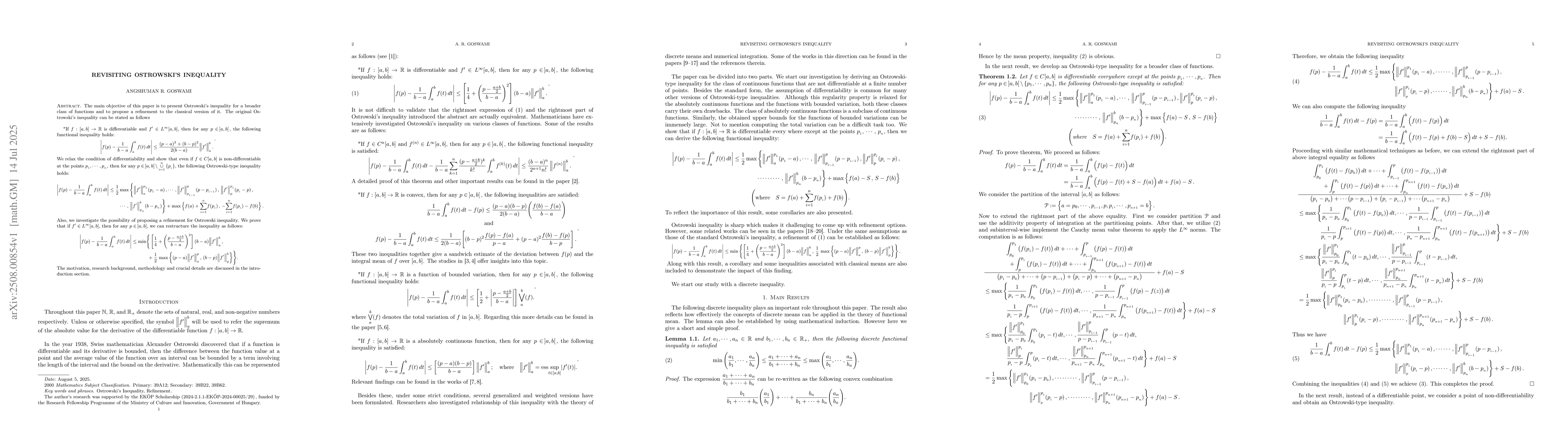 The main objective of this paper is to present Ostrowski's inequality for a broader class of functions and to propose a refinement to the classical version of it. The original Ostrowski's inequality can be stated as follows "If $f:[a,b]\to\mathbb{R}$ is differentiable and $f'\in L^{\infty}[a, b]$, then for any $p\in\,]a,b[\,$, the following functional inequality holds: \begin{equation*} \Bigg|f(p)-\dfrac{1}{b-a}\int_{a}^{b}f(t)\,dt\Bigg|\leq \dfrac{(p-a)^2+(b-p)^2}{2(b-a)}\Big\| f'\Big\|_a^b\,.\,^{^{^{^{^"}}}} \end{equation*} We relax the condition of differentiability and show that even if $f\in C[a,b]$ is non-differentiable at the points $p_{_{1}},\cdots,p_{_{n}}$, then for any $p\in\,]a,b[\,\setminus\overset{n}{\underset{i=1}{\cup}}\{p_{_{i}}\}$, the following Ostrowski-type inequality holds: \begin{align*} \left| f(p) - \frac{1}{b-a} \int_{a}^{b} f(t)\,dt \right| \leq \frac{1}{2} \max \Bigg\{ & \left\| f' \right\|_a^{p_1}(p_1 - a),\,\ldots,\, \left\| f' \right\|_{p_{i-1}}^p (p - p_{i-1}),\, \left\| f' \right\|_p^{p_i} (p_i - p),\, \\ & \ldots,\, \left\| f' \right\|_{p_n}^{b} (b - p_n) \Bigg\} + \max \left\{ f(a) + \sum_{i=1}^n f(p_i),\, -\sum_{i=1}^n f(p_i) - f(b) \right\}. \end{align*} Also, we investigate the possibility of proposing a refinement for Ostrowski inequality. We prove that if $f'\in L^{\infty}[a, b]$, then for any $p\in\,]a,b[$, we can restructure the inequality as follows: \begin{align*} \left| f(p) - \frac{1}{b-a} \int_{a}^{b} f(t)\,dt \right| \leq \min \Bigg\{ & \left[ \frac{1}{4} + \left( \frac{p - \frac{a + b}{2}}{b - a} \right)^2 \right](b - a) \left\| f' \right\|_{a}^{b}, \\ &\quad + \frac{1}{2} \max \left\{ (p - a) \left\| f' \right\|_{a}^{p},\, (b - p) \left\| f' \right\|_{p}^{b} \right\} \Bigg\}. \end{align*}