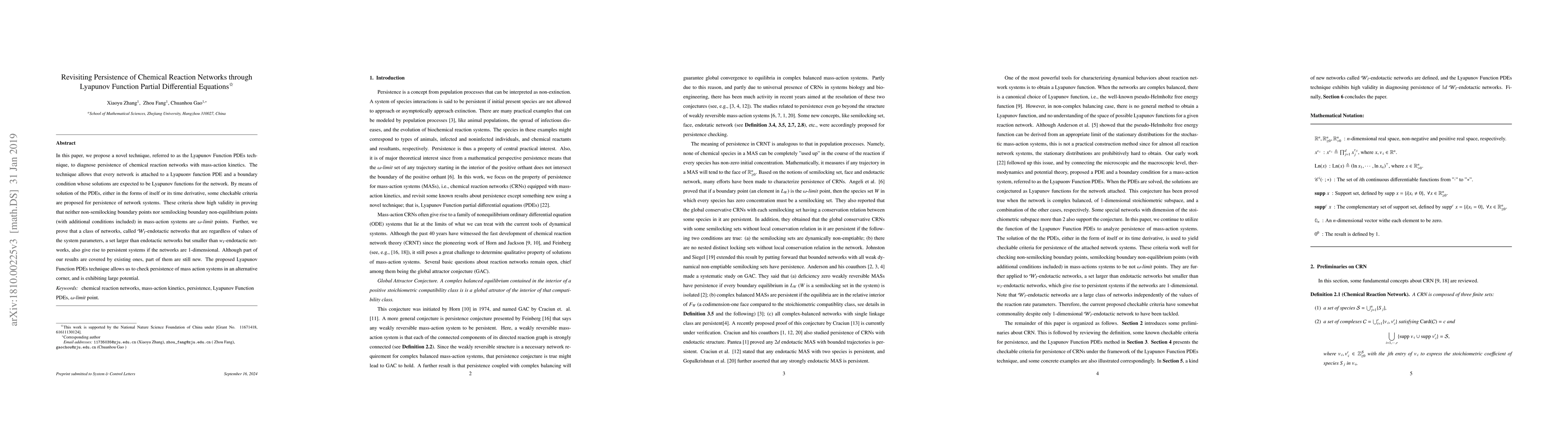 This paper introduces a novel Lyapunov Function PDEs technique to assess the persistence of chemical reaction networks with mass-action kinetics. The technique uses solutions of PDEs to propose criteria for network persistence, demonstrating that certain boundary points are not $\omega$-$limit$ points, and proving persistence for a class of $\mathcal{W}_{I}$-endotactic networks.