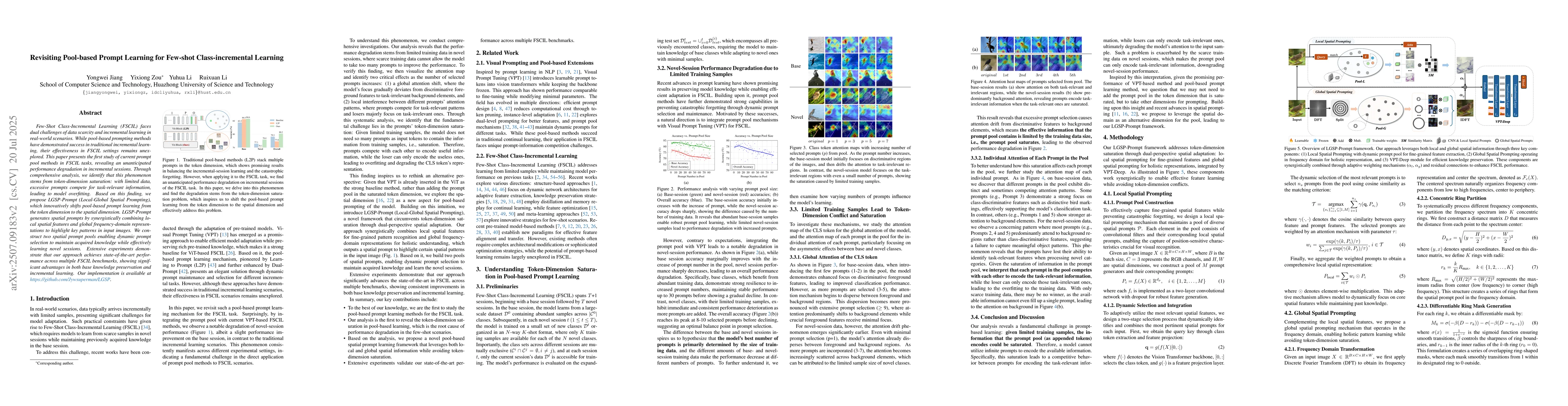 Few-Shot Class-Incremental Learning (FSCIL) faces dual challenges of data scarcity and incremental learning in real-world scenarios. While pool-based prompting methods have demonstrated success in traditional incremental learning, their effectiveness in FSCIL settings remains unexplored. This paper presents the first study of current prompt pool methods in FSCIL tasks, revealing an unanticipated performance degradation in incremental sessions. Through comprehensive analysis, we identify that this phenomenon stems from token-dimension saturation: with limited data, excessive prompts compete for task-relevant information, leading to model overfitting. Based on this finding, we propose LGSP-Prompt (Local-Global Spatial Prompting), which innovatively shifts pool-based prompt learning from the token dimension to the spatial dimension. LGSP-Prompt generates spatial prompts by synergistically combining local spatial features and global frequency-domain representations to highlight key patterns in input images. We construct two spatial prompt pools enabling dynamic prompt selection to maintain acquired knowledge while effectively learning novel sessions. Extensive experiments demonstrate that our approach achieves state-of-the-art performance across multiple FSCIL benchmarks, showing significant advantages in both base knowledge preservation and incremental learning. Our implementation is available at https://github.com/Jywsuperman/LGSP.