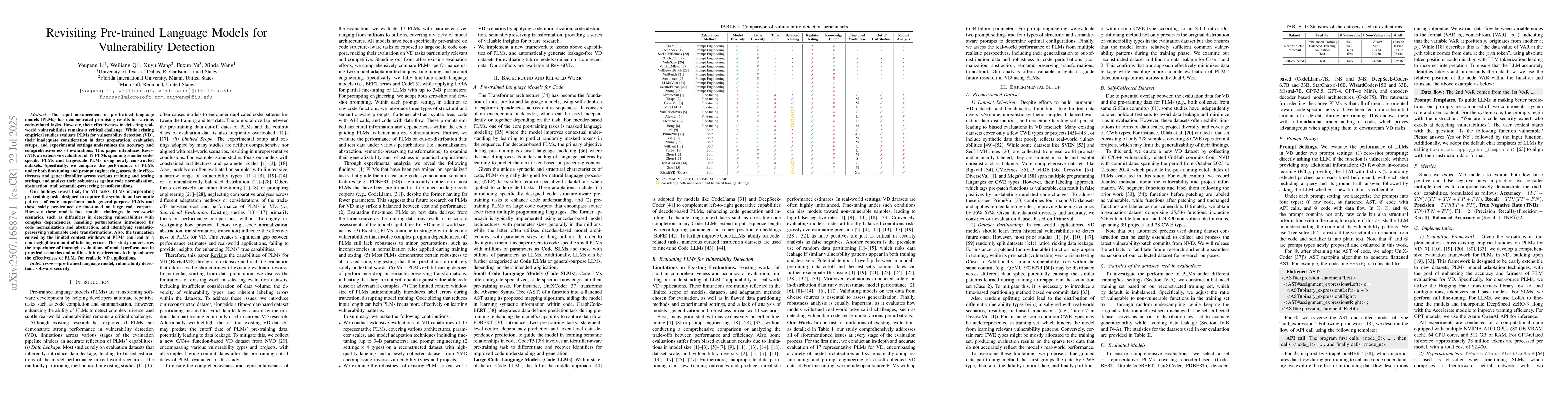 The rapid advancement of pre-trained language models (PLMs) has demonstrated promising results for various code-related tasks. However, their effectiveness in detecting real-world vulnerabilities remains a critical challenge. % for the security community. While existing empirical studies evaluate PLMs for vulnerability detection (VD), their inadequate consideration in data preparation, evaluation setups, and experimental settings undermines the accuracy and comprehensiveness of evaluations. This paper introduces RevisitVD, an extensive evaluation of 17 PLMs spanning smaller code-specific PLMs and large-scale PLMs using newly constructed datasets. Specifically, we compare the performance of PLMs under both fine-tuning and prompt engineering, assess their effectiveness and generalizability across various training and testing settings, and analyze their robustness against code normalization, abstraction, and semantic-preserving transformations. Our findings reveal that, for VD tasks, PLMs incorporating pre-training tasks designed to capture the syntactic and semantic patterns of code outperform both general-purpose PLMs and those solely pre-trained or fine-tuned on large code corpora. However, these models face notable challenges in real-world scenarios, such as difficulties in detecting vulnerabilities with complex dependencies, handling perturbations introduced by code normalization and abstraction, and identifying semantic-preserving vulnerable code transformations. Also, the truncation caused by the limited context windows of PLMs can lead to a non-negligible amount of labeling errors. This study underscores the importance of thorough evaluations of model performance in practical scenarios and outlines future directions to help enhance the effectiveness of PLMs for realistic VD applications.