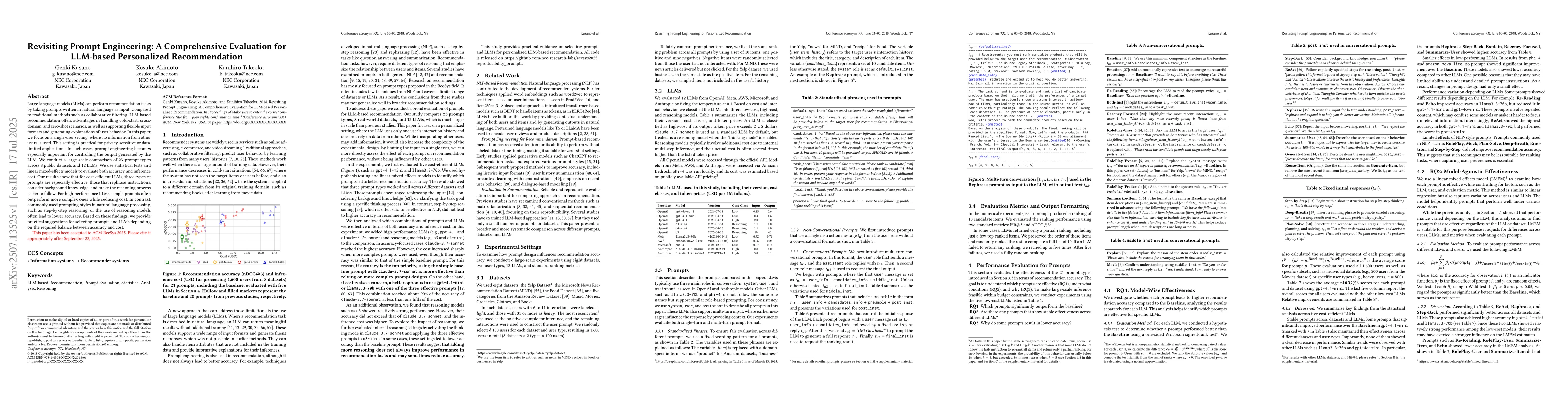 Large language models (LLMs) can perform recommendation tasks by taking prompts written in natural language as input. Compared to traditional methods such as collaborative filtering, LLM-based recommendation offers advantages in handling cold-start, cross-domain, and zero-shot scenarios, as well as supporting flexible input formats and generating explanations of user behavior. In this paper, we focus on a single-user setting, where no information from other users is used. This setting is practical for privacy-sensitive or data-limited applications. In such cases, prompt engineering becomes especially important for controlling the output generated by the LLM. We conduct a large-scale comparison of 23 prompt types across 8 public datasets and 12 LLMs. We use statistical tests and linear mixed-effects models to evaluate both accuracy and inference cost. Our results show that for cost-efficient LLMs, three types of prompts are especially effective: those that rephrase instructions, consider background knowledge, and make the reasoning process easier to follow. For high-performance LLMs, simple prompts often outperform more complex ones while reducing cost. In contrast, commonly used prompting styles in natural language processing, such as step-by-step reasoning, or the use of reasoning models often lead to lower accuracy. Based on these findings, we provide practical suggestions for selecting prompts and LLMs depending on the required balance between accuracy and cost.