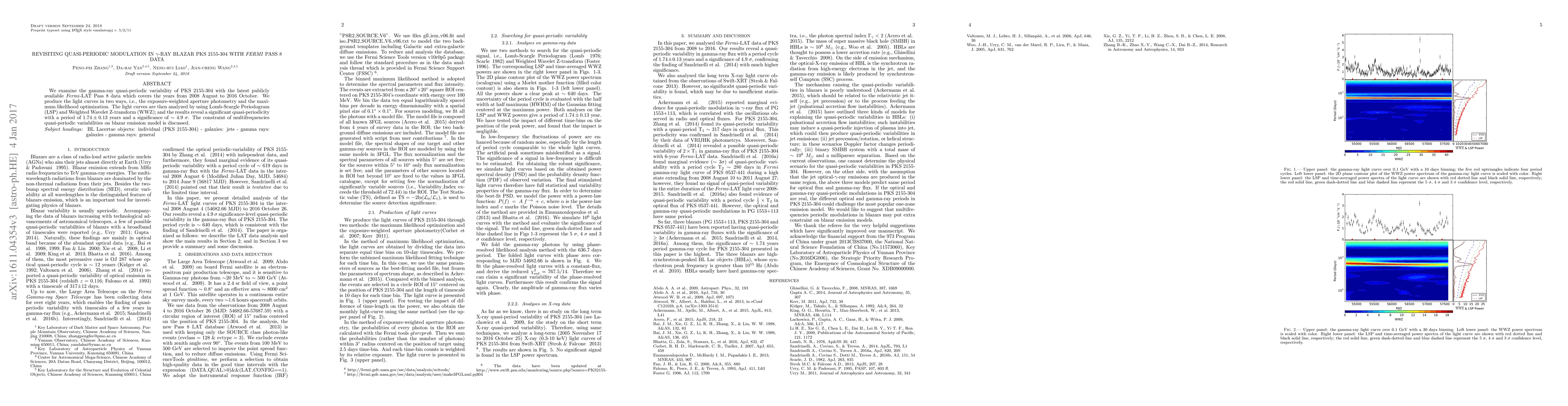 This study analyzes the gamma-ray quasi-periodic variability of blazar PKS 2155-304 using Fermi-LAT Pass 8 data from 2008 to 2016, revealing a significant quasi-periodicity with a period of $1.74\pm0.13$ years at $\sim$ 4.9 $\sigma$ significance, and discusses its implications for blazar emission models.
