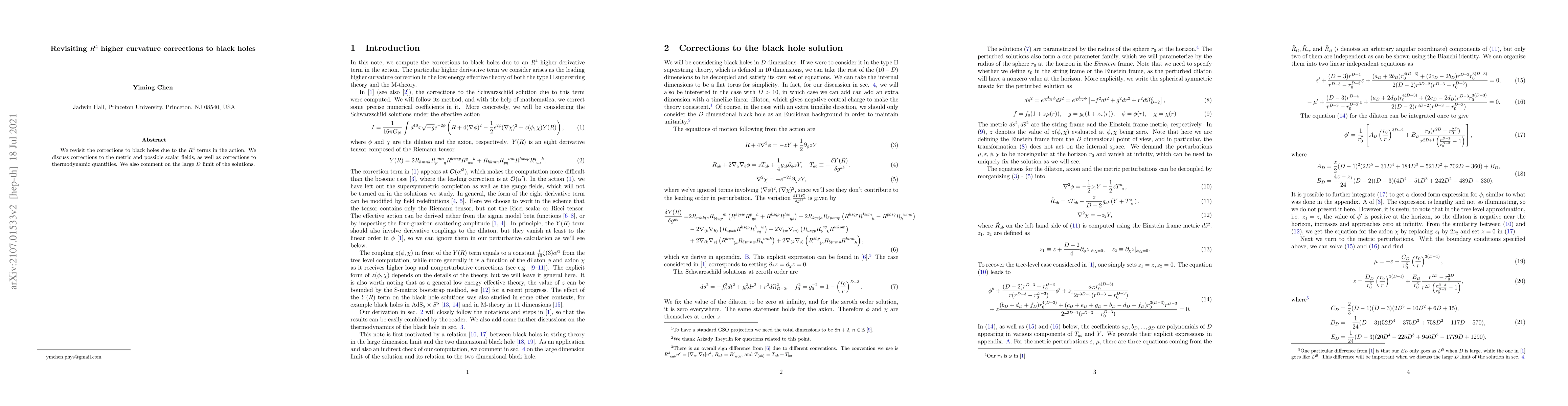 We revisit the corrections to black holes due to the $R^4$ terms in the action. We discuss corrections to the metric and possible scalar fields, as well as corrections to thermodynamic quantities. We also comment on the large $D$ limit of the solutions.