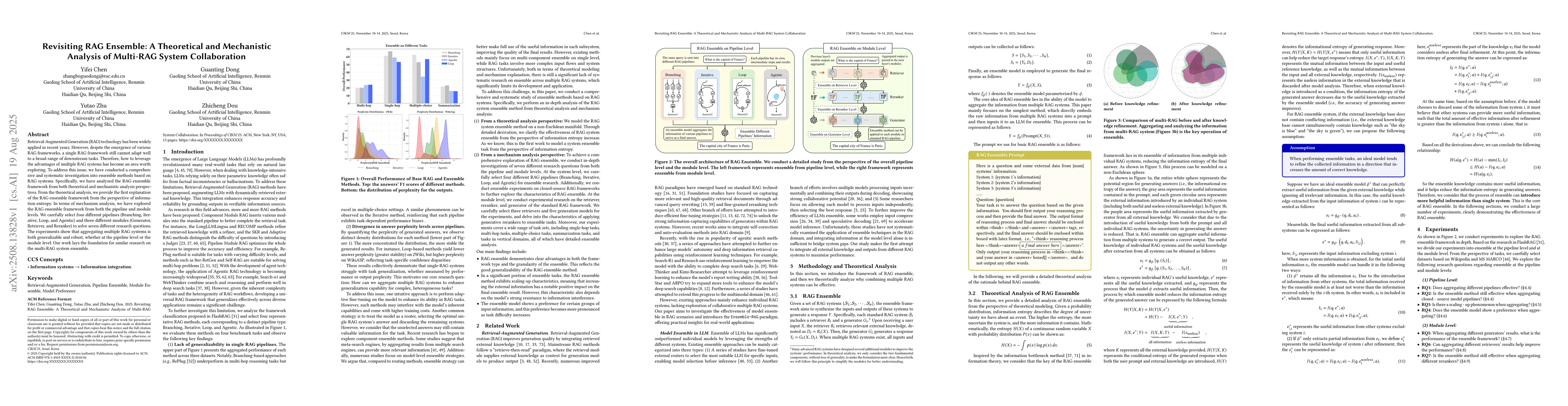 Retrieval-Augmented Generation (RAG) technology has been widely applied in recent years. However, despite the emergence of various RAG frameworks, a single RAG framework still cannot adapt well to a broad range of downstream tasks. Therefore, how to leverage the advantages of multiple RAG systems has become an area worth exploring. To address this issue, we have conducted a comprehensive and systematic investigation into ensemble methods based on RAG systems. Specifically, we have analyzed the RAG ensemble framework from both theoretical and mechanistic analysis perspectives. From the theoretical analysis, we provide the first explanation of the RAG ensemble framework from the perspective of information entropy. In terms of mechanism analysis, we have explored the RAG ensemble framework from both the pipeline and module levels. We carefully select four different pipelines (Branching, Iterative, Loop, and Agentic) and three different modules (Generator, Retriever, and Reranker) to solve seven different research questions. The experiments show that aggregating multiple RAG systems is both generalizable and robust, whether at the pipeline level or the module level. Our work lays the foundation for similar research on the multi-RAG system ensemble.