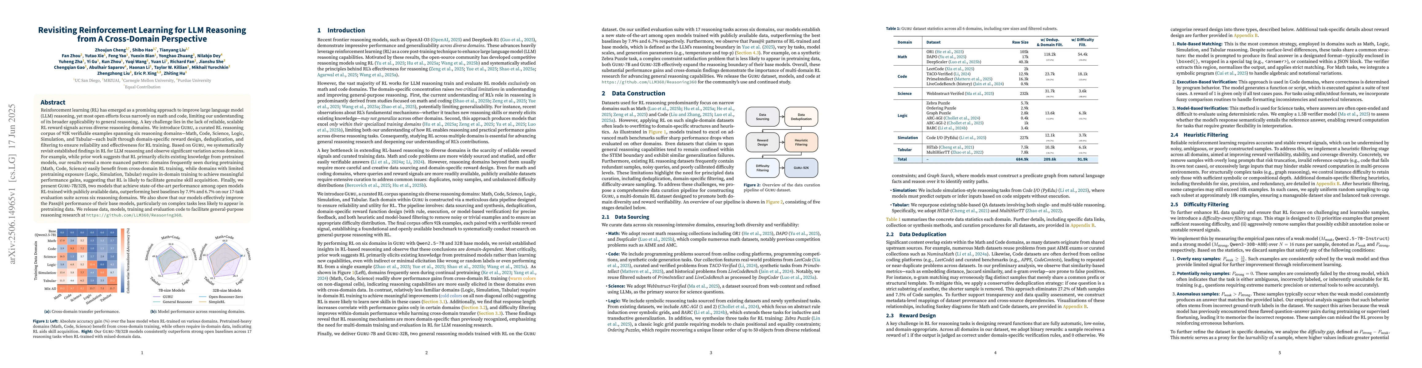 Reinforcement learning (RL) has emerged as a promising approach to improve large language model (LLM) reasoning, yet most open efforts focus narrowly on math and code, limiting our understanding of its broader applicability to general reasoning. A key challenge lies in the lack of reliable, scalable RL reward signals across diverse reasoning domains. We introduce Guru, a curated RL reasoning corpus of 92K verifiable examples spanning six reasoning domains--Math, Code, Science, Logic, Simulation, and Tabular--each built through domain-specific reward design, deduplication, and filtering to ensure reliability and effectiveness for RL training. Based on Guru, we systematically revisit established findings in RL for LLM reasoning and observe significant variation across domains. For example, while prior work suggests that RL primarily elicits existing knowledge from pretrained models, our results reveal a more nuanced pattern: domains frequently seen during pretraining (Math, Code, Science) easily benefit from cross-domain RL training, while domains with limited pretraining exposure (Logic, Simulation, and Tabular) require in-domain training to achieve meaningful performance gains, suggesting that RL is likely to facilitate genuine skill acquisition. Finally, we present Guru-7B and Guru-32B, two models that achieve state-of-the-art performance among open models RL-trained with publicly available data, outperforming best baselines by 7.9% and 6.7% on our 17-task evaluation suite across six reasoning domains. We also show that our models effectively improve the Pass@k performance of their base models, particularly on complex tasks less likely to appear in pretraining data. We release data, models, training and evaluation code to facilitate general-purpose reasoning at: https://github.com/LLM360/Reasoning360