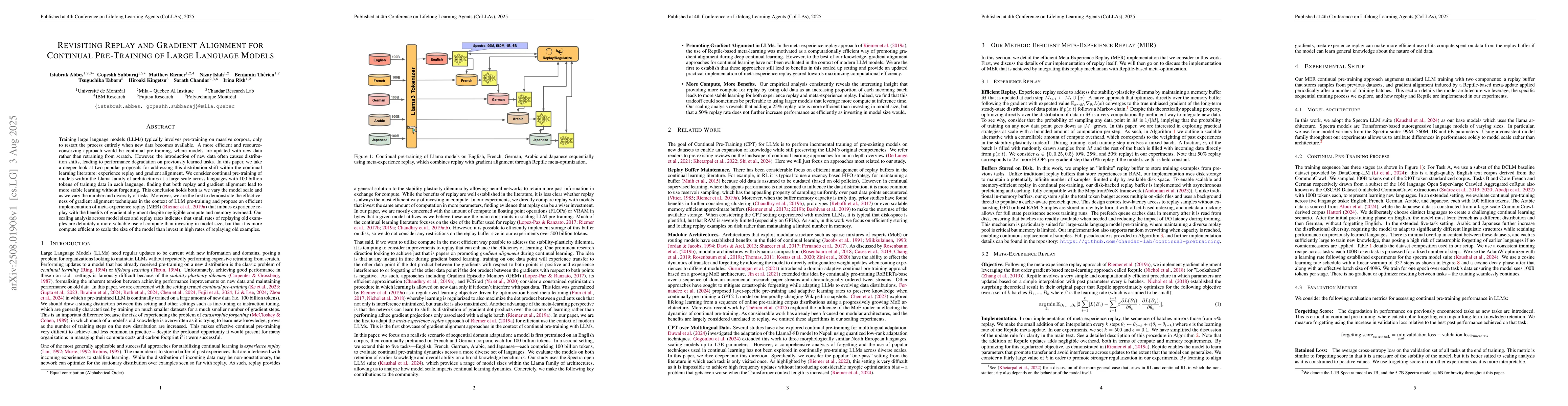 Training large language models (LLMs) typically involves pre-training on massive corpora, only to restart the process entirely when new data becomes available. A more efficient and resource-conserving approach would be continual pre-training, where models are updated with new data rather than retraining from scratch. However, the introduction of new data often causes distribution shifts, leading to performance degradation on previously learned tasks. In this paper, we take a deeper look at two popular proposals for addressing this distribution shift within the continual learning literature: experience replay and gradient alignment. We consider continual pre-training of models within the Llama family of architectures at a large scale across languages with 100 billion tokens of training data in each language, finding that both replay and gradient alignment lead to more stable learning without forgetting. This conclusion holds both as we vary the model scale and as we vary the number and diversity of tasks. Moreover, we are the first to demonstrate the effectiveness of gradient alignment techniques in the context of LLM pre-training and propose an efficient implementation of meta-experience replay (MER) that imbues experience replay with the benefits of gradient alignment despite negligible compute and memory overhead. Our scaling analysis across model sizes and replay rates indicates that small rates of replaying old examples are definitely a more valuable use of compute than investing in model size, but that it is more compute efficient to scale the size of the model than invest in high rates of replaying old examples.