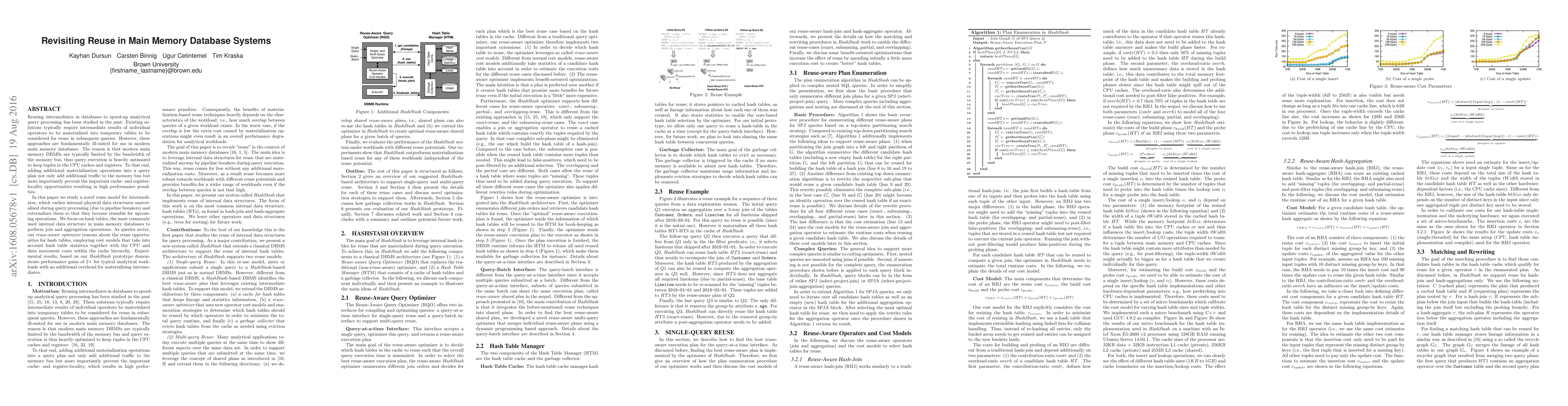 This paper proposes a novel reuse model for intermediates in main memory database systems, focusing on caching and reusing internal hash tables to enhance query performance without additional materialization overhead. Experimental results show a $2\times$ performance gain for analytical workloads using the HashStash prototype.