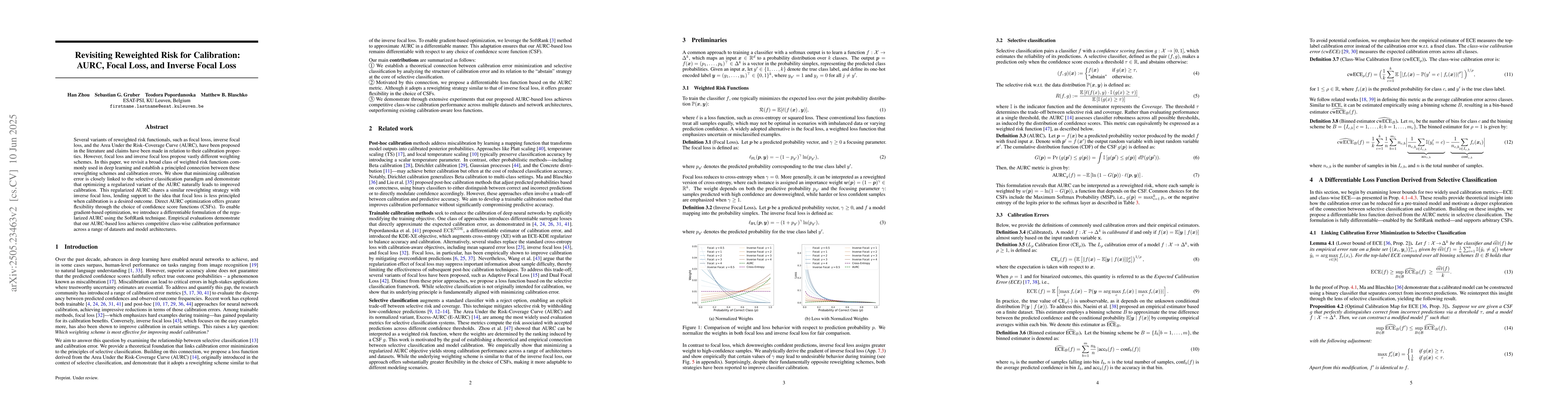 The paper revisits a broad class of weighted risk functions, establishing a principled connection between reweighting schemes and calibration errors. It introduces a differentiable formulation of a regularized Area Under the Risk-Coverage Curve (AURC) using SoftRank, enabling gradient-based optimization.