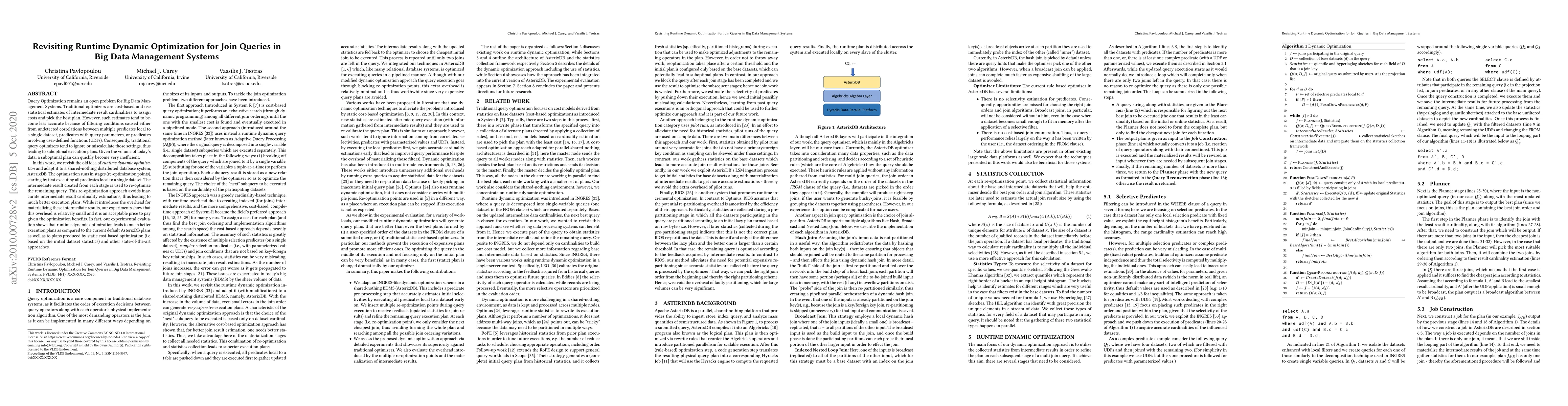 This paper proposes a runtime dynamic optimization approach for join queries in AsterixDB, addressing the inaccuracy of traditional cost-based query optimizers. The method re-optimizes query plans at stages using intermediate results, yielding more efficient execution plans despite minor overhead. Experimental results demonstrate significant improvements over static optimization and current default plans.