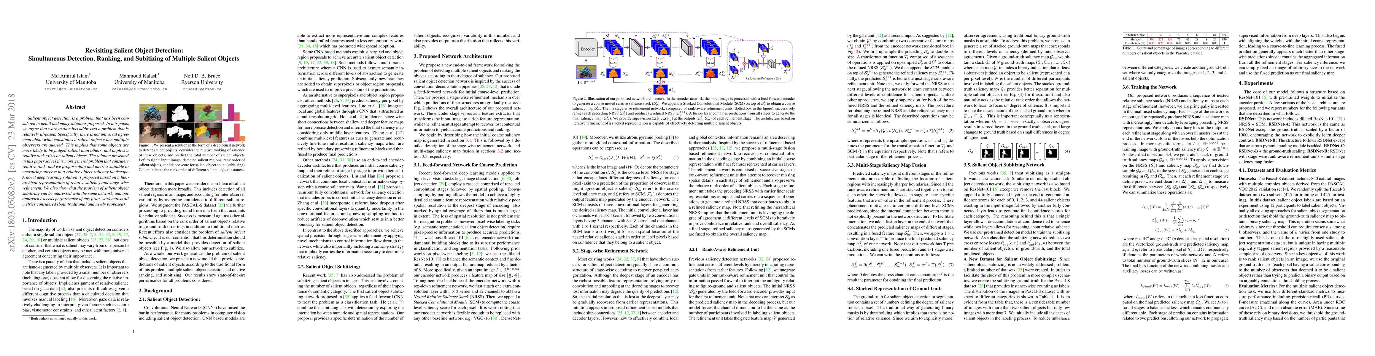 This paper proposes a novel deep learning approach for detecting, ranking, and subitizing multiple salient objects, addressing the ambiguity of what constitutes a salient object among multiple observers. The method achieves superior performance compared to prior work by considering relative saliency and employing a hierarchical representation.