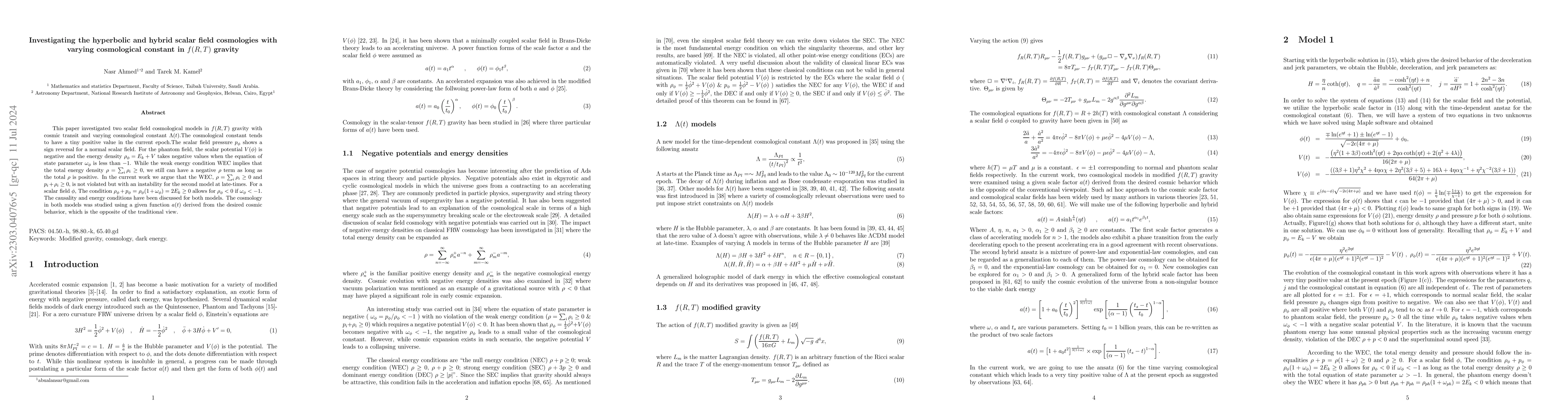 Two scalar field cosmological models in $f(R,T)$ gravity with cosmic transit and varying cosmological constant have been investigated. The time-dependent cosmological constant $\Lambda(t)$ is positive and tends to a very small value at the present epoch. The scalar field pressure $p_{\phi}$ shows a sign flipping for normal scalar field. For the phantom field, the scalar potential $V(\phi)$ is negative and the energy density $\rho_{\phi}=E_k+V$ takes negative values when the equation of state parameter $\omega_{\phi}<-1$. While the weak energy condition WEC implies that the total energy density $\rho=\sum_i\rho_i\geq 0$, we still can have a negative $\rho$ term as long as the total $\rho$ is positive. In the current work we argue that the WEC, $\rho=\sum_i \rho_i \geq 0$ and $p_i+\rho_i \geq 0$, is not violated. For a scalar field $\phi$, The condition $\rho_{\phi}+p_{\phi}=\rho_{\phi} (1+\omega_{\phi})=2E_k\geq 0$ allows for $\rho_{\phi}<0$ if $\omega_{\phi}<-1$. The cosmology in both models has been probed using a given function $a(t)$ deduced from the desired cosmic behavior which is the opposite of the conventional viewpoint.
