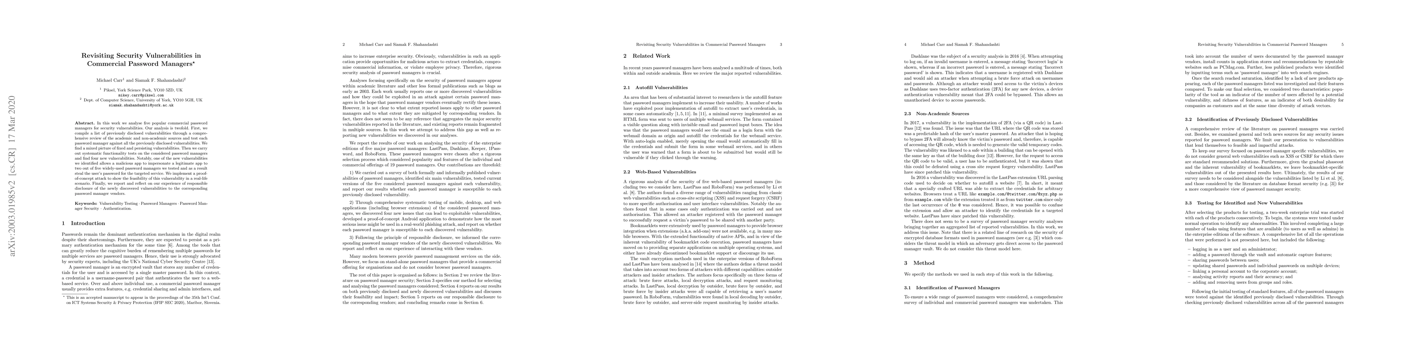 This paper analyzes five popular commercial password managers for security vulnerabilities, identifying both previously disclosed and four new vulnerabilities, including a critical flaw that allows malicious apps to impersonate legitimate ones and steal user passwords. The authors also discuss their responsible disclosure process with the vendors.
