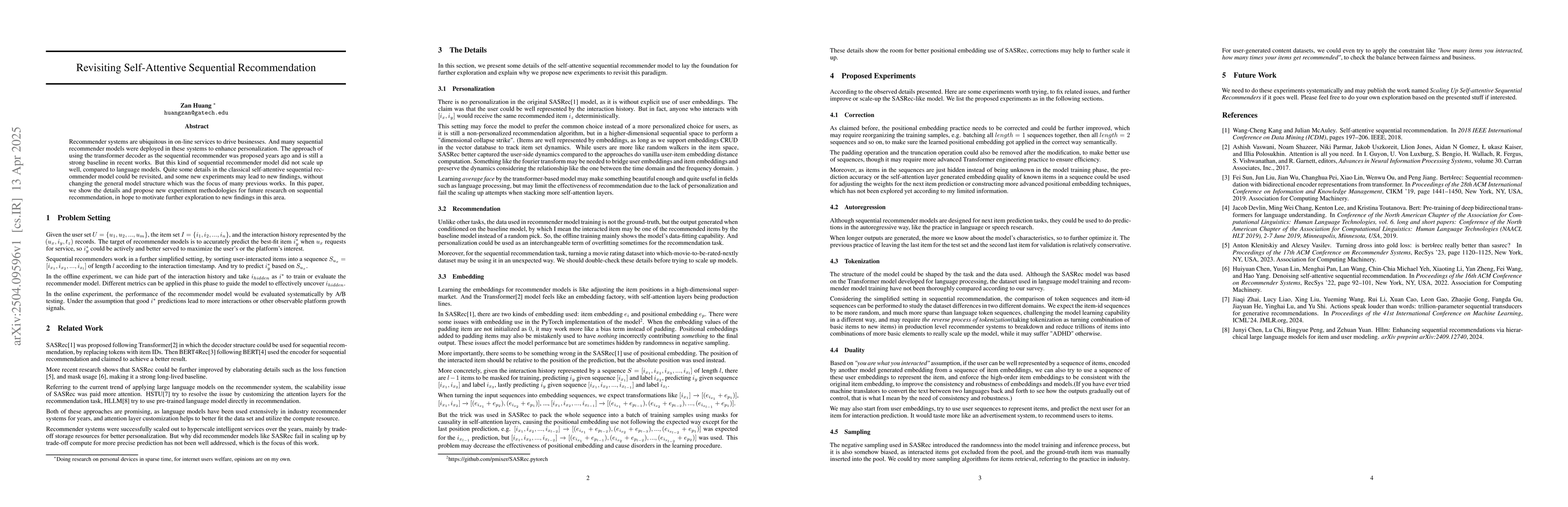 This paper revisits the classical self-attentive sequential recommender models, particularly the transformer decoder approach, to identify areas for improvement without altering the model's fundamental structure. It proposes new experimental methodologies to inspire further research on enhancing the scalability and performance of sequential recommender systems.