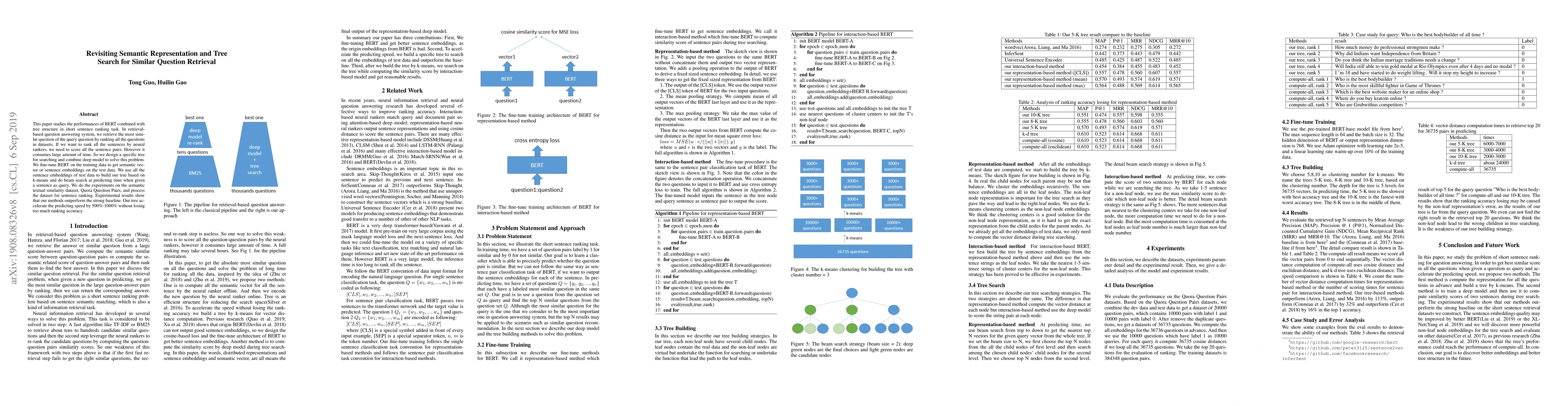 This paper studies the performances of BERT combined with tree structure in short sentence ranking task. In retrieval-based question answering system, we retrieve the most similar question of the query question by ranking all the questions in datasets. If we want to rank all the sentences by neural rankers, we need to score all the sentence pairs. However it consumes large amount of time. So we design a specific tree for searching and combine deep model to solve this problem. We fine-tune BERT on the training data to get semantic vector or sentence embeddings on the test data. We use all the sentence embeddings of test data to build our tree based on k-means and do beam search at predicting time when given a sentence as query. We do the experiments on the semantic textual similarity dataset, Quora Question Pairs, and process the dataset for sentence ranking. Experimental results show that our methods outperform the strong baseline. Our tree accelerate the predicting speed by 500%-1000% without losing too much ranking accuracy.