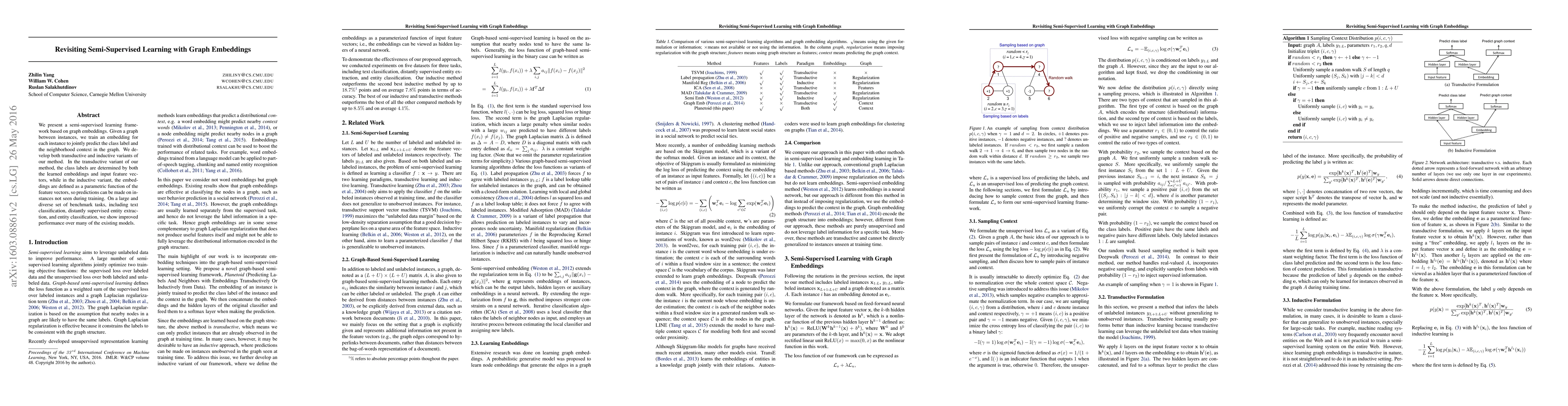 This paper proposes a semi-supervised learning framework using graph embeddings to predict class labels and neighborhood context. It develops both transductive and inductive variants, showing improved performance over existing models on various benchmark tasks.