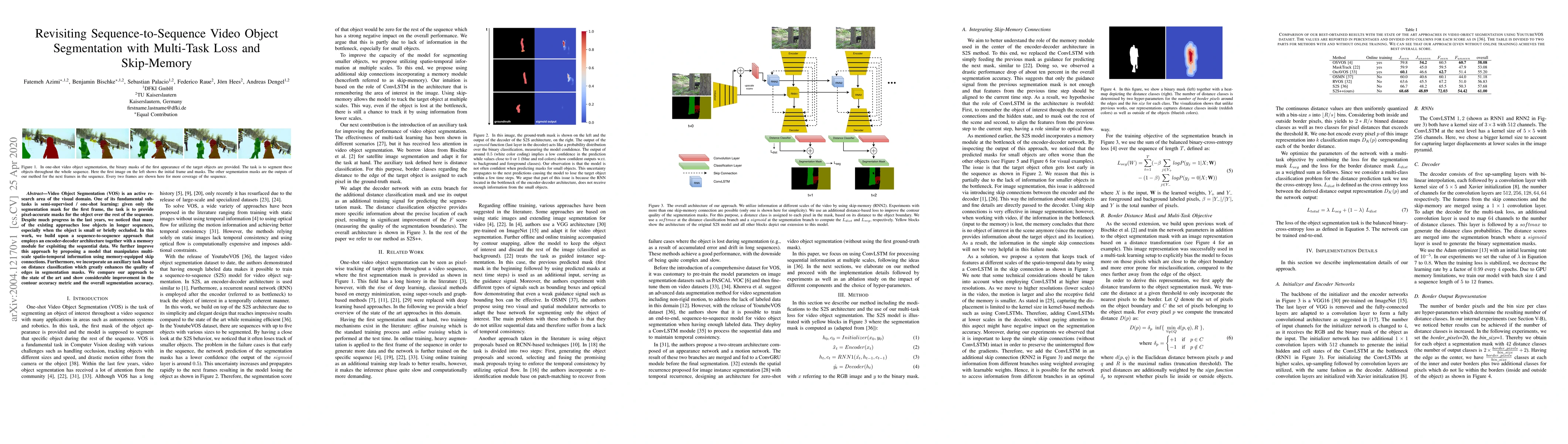 This paper revisits sequence-to-sequence video object segmentation using multi-task loss and skip-memory to enhance contour accuracy and overall segmentation precision, especially for small or briefly occluded objects in longer sequences. The proposed model improves existing methods by incorporating memory-equipped skip connections and an auxiliary task for edge quality.