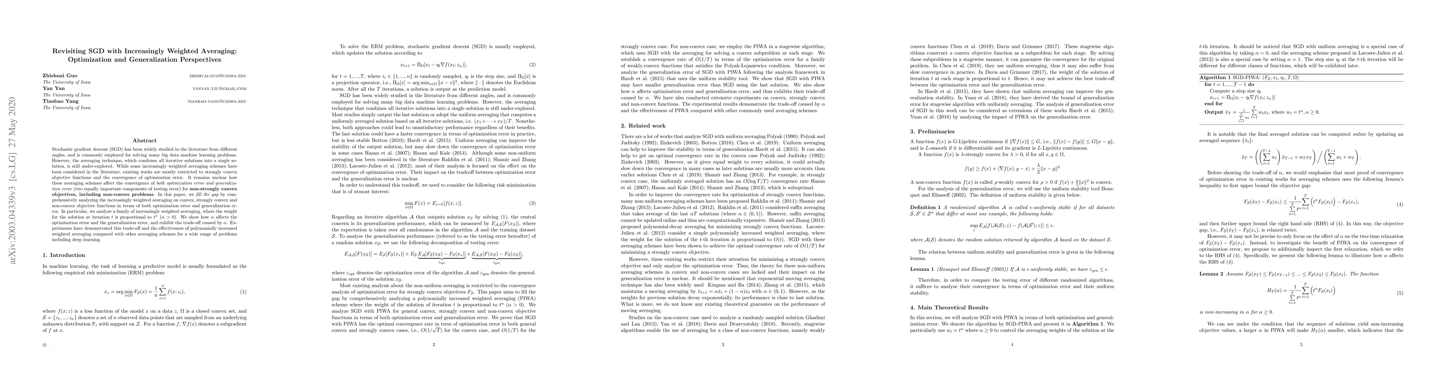 This paper investigates increasingly weighted averaging schemes in SGD for optimizing convex, strongly convex, and non-convex objectives, analyzing both optimization and generalization errors. It reveals the trade-off influenced by the weighting parameter $\alpha$ and demonstrates the effectiveness of polynomially increased weights in various machine learning tasks.