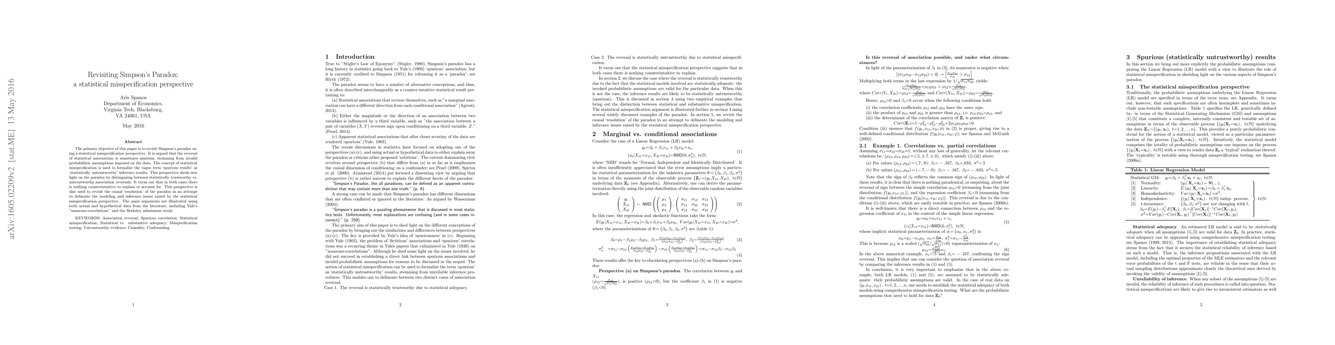 The primary objective of this paper is to revisit Simpson's paradox using a statistical misspecification perspective. It is argued that the reversal of statistical associations is sometimes spurious, stemming from invalid probabilistic assumptions imposed on the data. The concept of statistical misspecification is used to formalize the vague term `spurious results' as `statistically untrustworthy' inference results. This perspective sheds new light on the paradox by distingusing between statistically trustworthy vs. untrustworthy association reversals. It turns out that in both cases there is nothing counterintuitive to explain or account for. This perspective is also used to revisit the causal `resolution' of the paradox in an attempt to delineate the modeling and inference issues raised by the statistical misspecification perspective. The main arguments are illustrated using both actual and hypothetical data from the literature, including Yule's "nonsense-correlations" and the Berkeley admissions study.