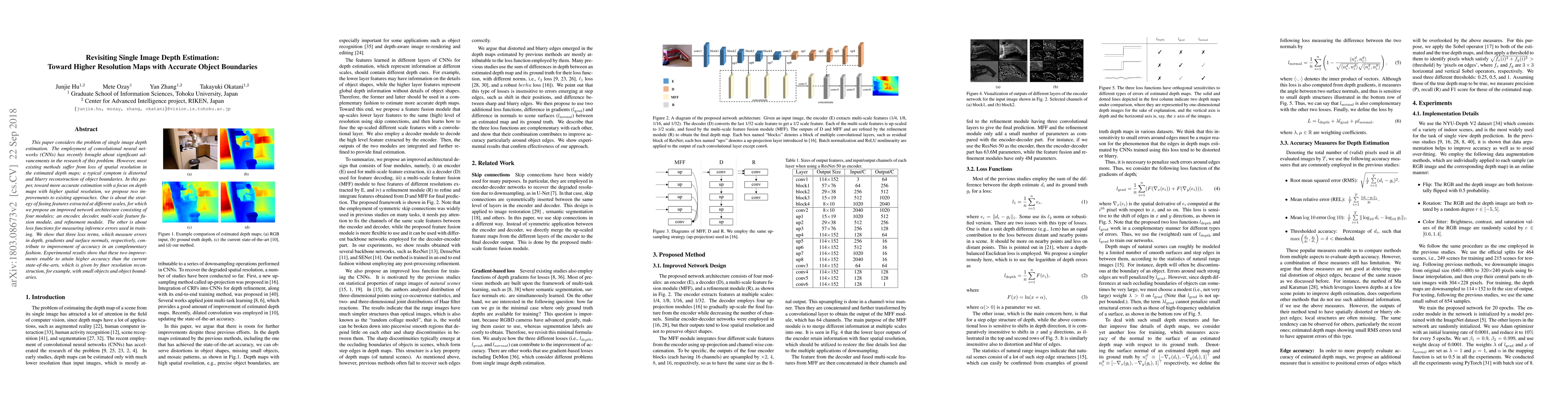 This paper considers the problem of single image depth estimation. The employment of convolutional neural networks (CNNs) has recently brought about significant advancements in the research of this problem. However, most existing methods suffer from loss of spatial resolution in the estimated depth maps; a typical symptom is distorted and blurry reconstruction of object boundaries. In this paper, toward more accurate estimation with a focus on depth maps with higher spatial resolution, we propose two improvements to existing approaches. One is about the strategy of fusing features extracted at different scales, for which we propose an improved network architecture consisting of four modules: an encoder, decoder, multi-scale feature fusion module, and refinement module. The other is about loss functions for measuring inference errors used in training. We show that three loss terms, which measure errors in depth, gradients and surface normals, respectively, contribute to improvement of accuracy in an complementary fashion. Experimental results show that these two improvements enable to attain higher accuracy than the current state-of-the-arts, which is given by finer resolution reconstruction, for example, with small objects and object boundaries.