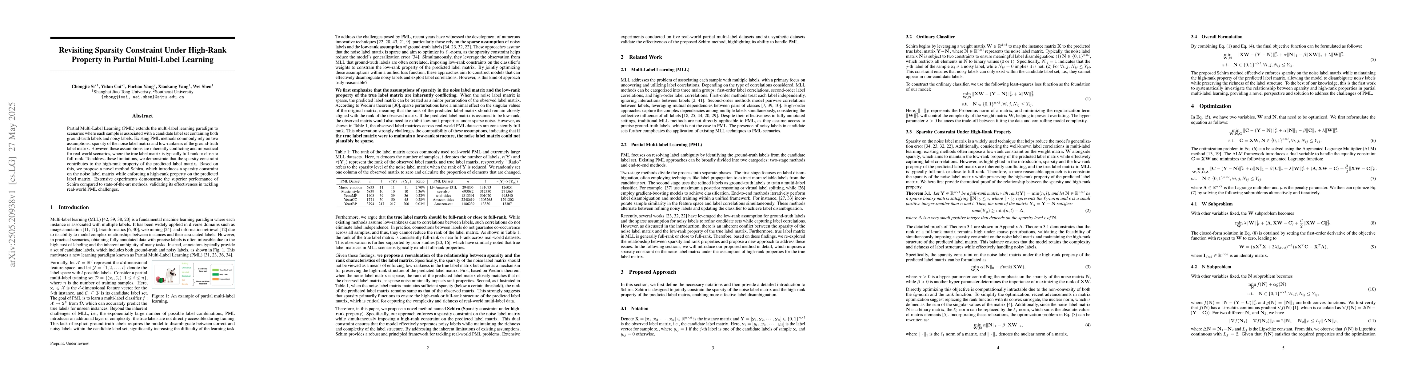 A new method called Schirn is proposed to address limitations of existing Partial Multi-Label Learning (PML) methods by introducing a sparsity constraint on the noise label matrix while maintaining high-rank property of the predicted label matrix.