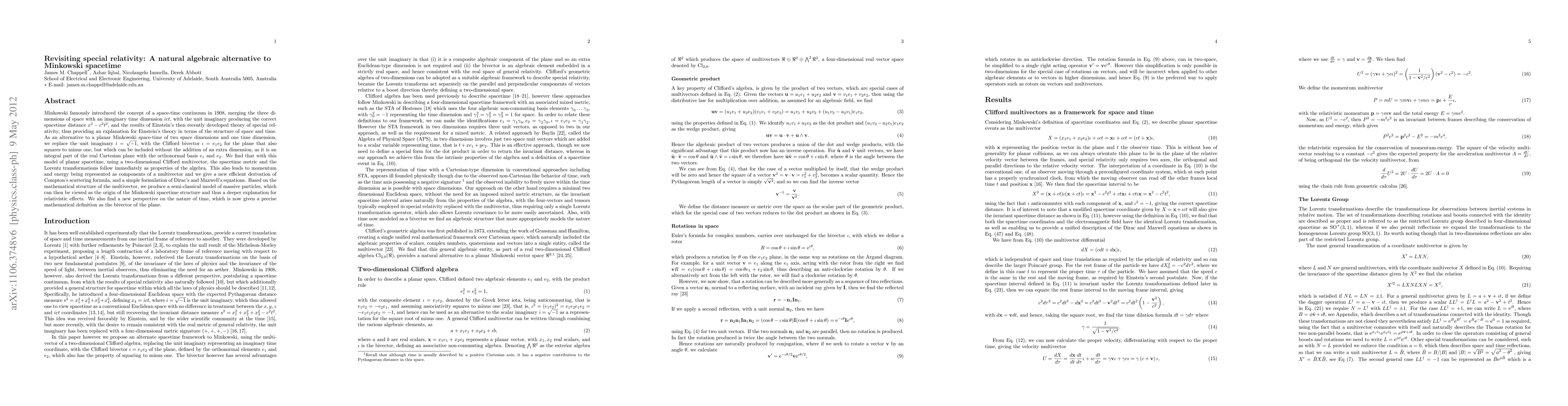 Researchers propose an alternative algebraic model to Minkowski spacetime, using a 2D Clifford multivector, which reproduces the Lorentz transformations and yields new derivations of Compton's scattering formula and Dirac's equations.