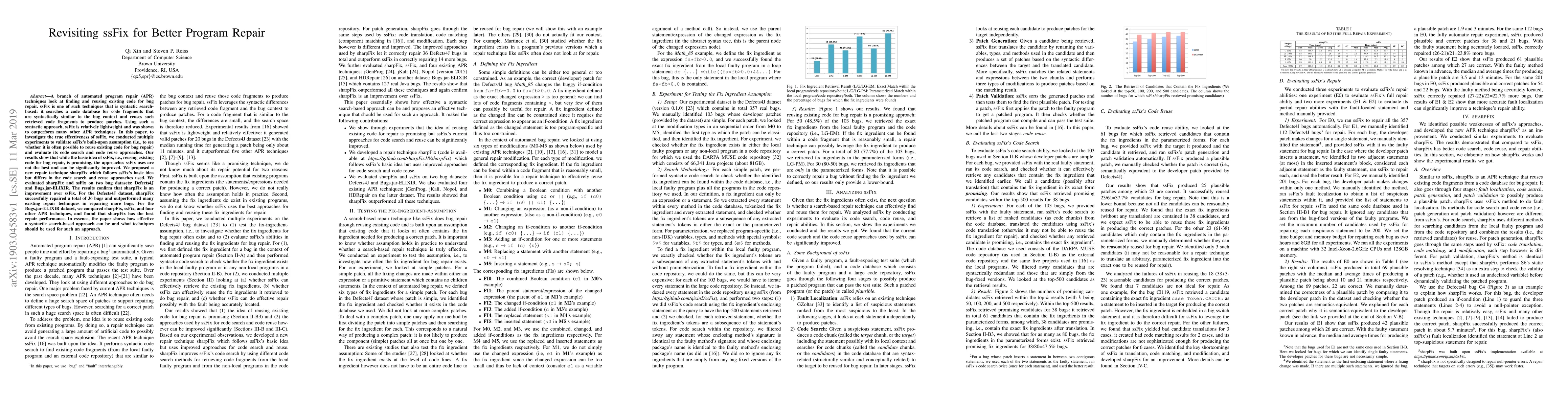 The paper introduces sharpFix, a new automated program repair technique that improves upon ssFix by enhancing code search and reuse approaches, demonstrating superior performance in repairing bugs.