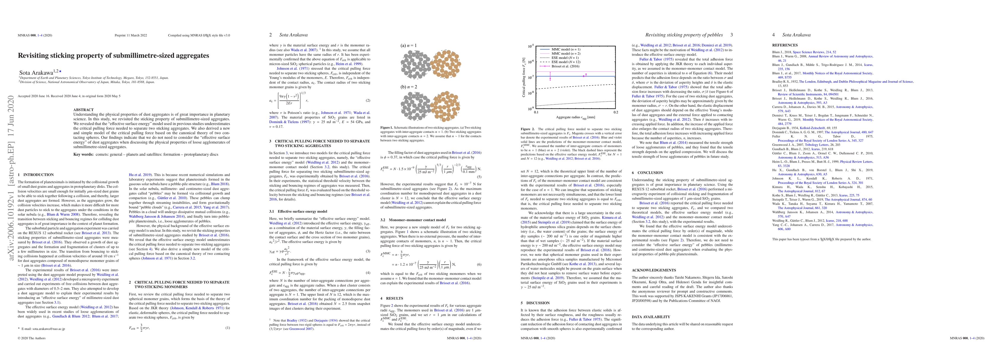 This study revisits the sticking property of submillimetre-sized aggregates, finding that the "effective surface energy" model underestimates the critical pulling force needed to separate them. A new model based on the canonical theory of two contacting spheres is proposed, indicating that the "effective surface energy" is not necessary for discussing the physical properties of these aggregates.