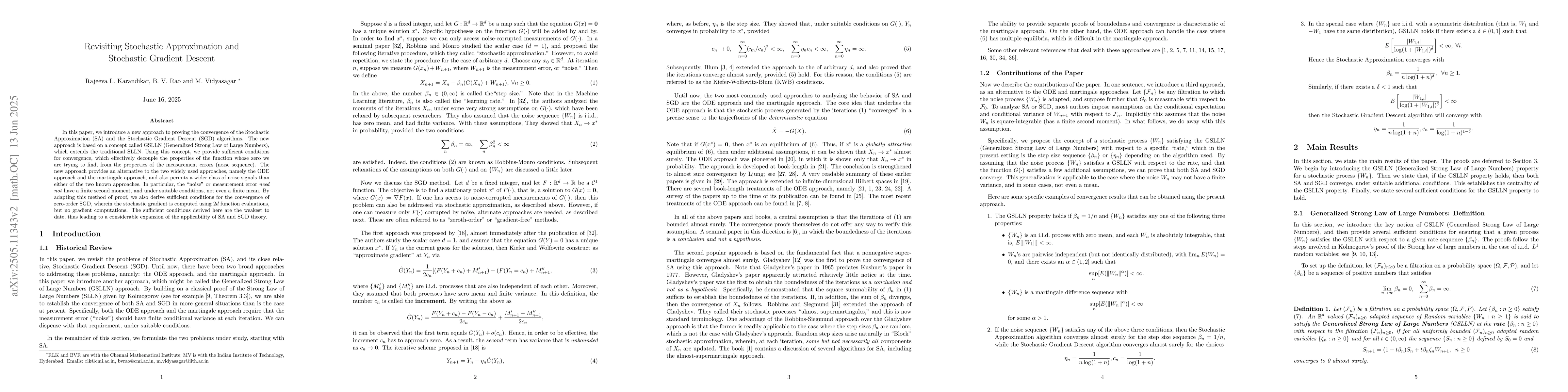 In this paper, we take a fresh look at stochastic approximation (SA) and Stochastic Gradient Descent (SGD). We derive new sufficient conditions for the convergence of SA. In particular, the "noise" or measurement error need not have a finite second moment, and under suitable conditions, not even a finite mean. By adapting this method of proof, we also derive sufficient conditions for the convergence of zero-order SGD, wherein the stochastic gradient is computed using only two function evaluations, and no gradient computations. The sufficient conditions derived here are the weakest to date, thus leading to a considerable expansion of the applicability of SA and SGD theory.