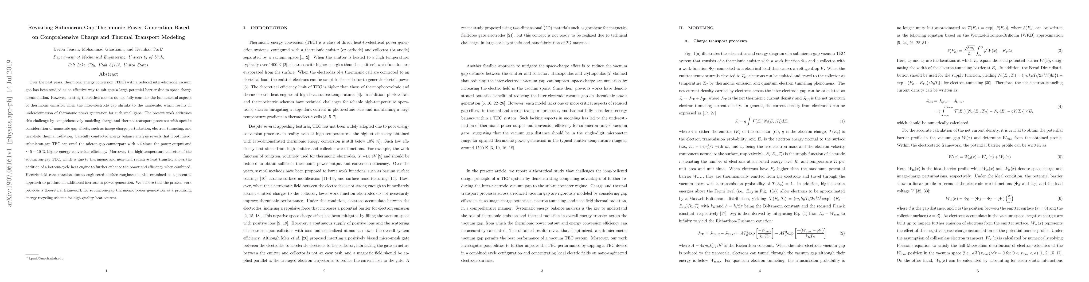 This paper revisits submicron-gap thermionic power generation, addressing the limitations of existing models by incorporating nanoscale effects. It demonstrates that optimized submicron-gap thermionic energy conversion can achieve up to 4 times higher power output and 5-10% better efficiency compared to micron-gap systems, with potential further enhancements via surface roughness engineering.