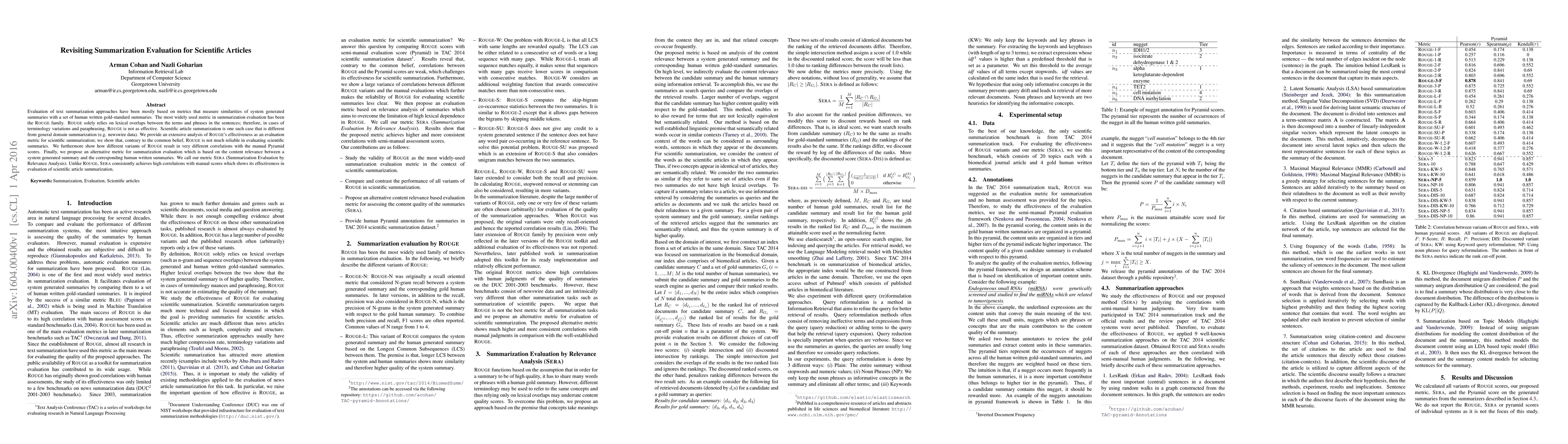 This paper critiques the use of ROUGE metrics for evaluating scientific article summarization, finding it unreliable due to its reliance on lexical overlaps. It proposes SERA, a new metric based on content relevance, which correlates better with manual evaluations.