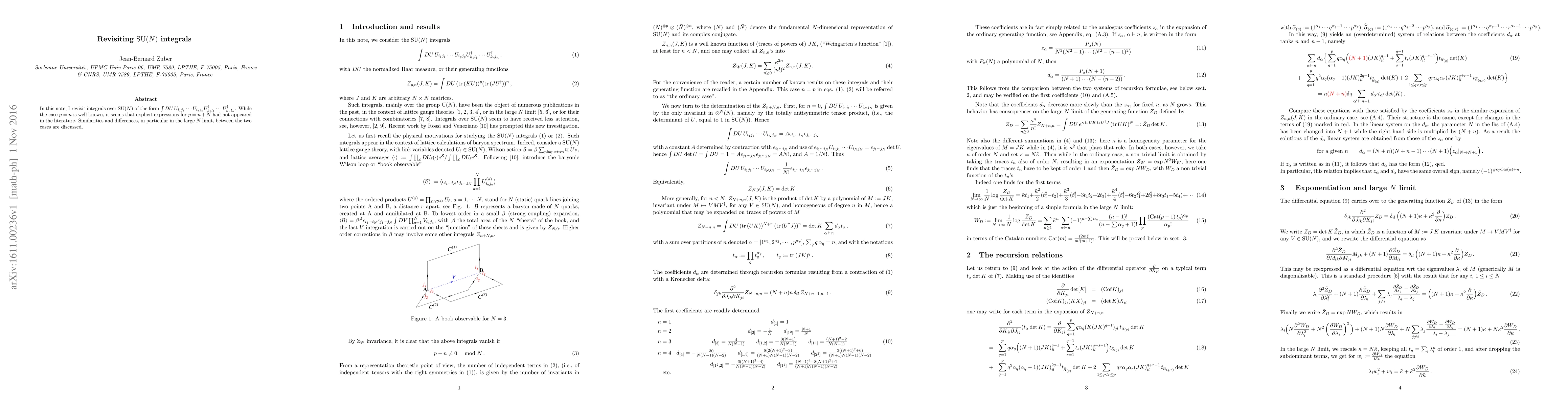 In this note, I revisit integrals over $\SU(N)$ of the form $ \int DU\, U_{i_1j_1}\cdots U_{i_pj_p}\Ud_{k_1l_1}\cdots \Ud_{k_nl_n}$. While the case $p=n$ is well known, it seems that explicit expressions for $p=n+N$ had not appeared in the literature. Similarities and differences, in particular in the large $N$ limit, between the two cases are discussed