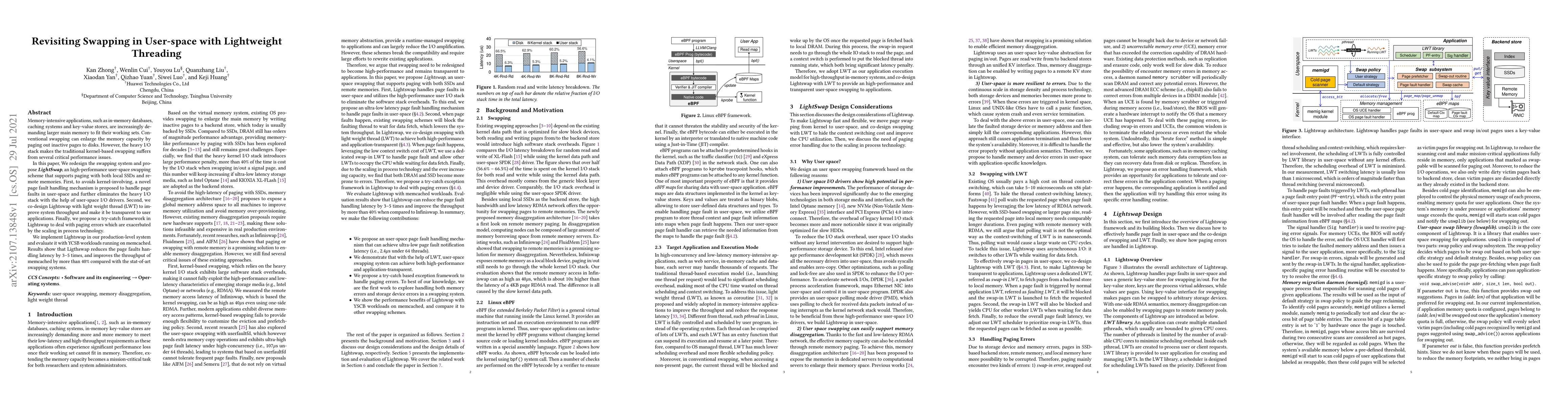 Memory-intensive applications, such as in-memory databases, caching systems and key-value stores, are increasingly demanding larger main memory to fit their working sets. Conventional swapping can enlarge the memory capacity by paging out inactive pages to disks. However, the heavy I/O stack makes the traditional kernel-based swapping suffers from several critical performance issues. In this paper, we redesign the swapping system and propose LightSwap, an high-performance user-space swapping scheme that supports paging with both local SSDs and remote memories. First, to avoids kernel-involving, a novel page fault handling mechanism is proposed to handle page faults in user-space and further eliminates the heavy I/O stack with the help of user-space I/O drivers. Second, we co-design Lightswap with light weight thread (LWT) to improve system throughput and make it be transparent to user applications. Finally, we propose a try-catch framework in Lightswap to deal with paging errors which are exacerbated by the scaling in process technology. We implement Lightswap in our production-level system and evaluate it with YCSB workloads running on memcached. Results show that Ligthswap reduces the page faults handling latency by 3--5 times, and improves the throughput of memcached by more than 40% compared with the stat-of-art swapping systems.