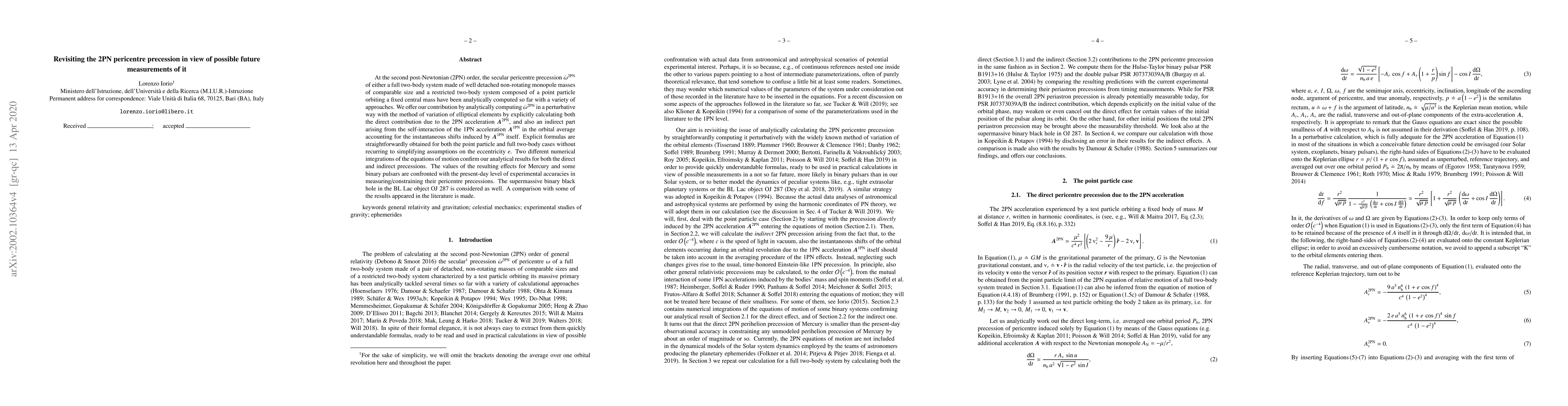 This paper analytically computes the 2PN pericentre precession for both a point particle and a full two-body system, considering both direct and indirect contributions. The results are validated through numerical integrations and compared with current experimental accuracies and literature results.