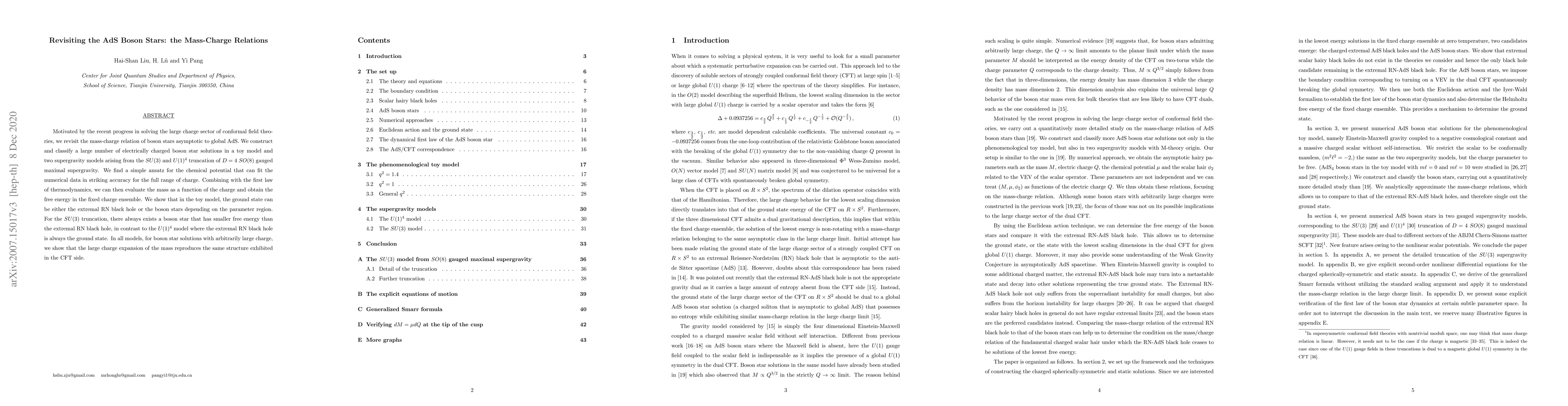 Motivated by the recent progress in solving the large charge sector of conformal field theories, we revisit the mass-charge relation of boson stars asymptotic to global AdS. We construct and classify a large number of electrically charged boson star solutions in a toy model and two supergravity models arising from the $SU(3)$ and $U(1)^4$ truncation of $D=4$ $SO(8)$ gauged maximal supergravity. We find a simple ansatz for the chemical potential that can fit the numerical data in striking accuracy for the full range of charge. Combining with the first law of thermodynamics, we can then evaluate the mass as a function of the charge and obtain the free energy in the fixed charge ensemble. We show that in the toy model, the ground state can be either the extremal RN black hole or the boson stars depending on the parameter region. For the $SU(3)$ truncation, there always exists a boson star that has smaller free energy than the extremal RN black hole, in contrast to the $U(1)^4$ model where the extremal RN black hole is always the ground state. In all models, for boson star solutions with arbitrarily large charge, we show that the large charge expansion of the mass reproduces the same structure exhibited in the CFT side.
