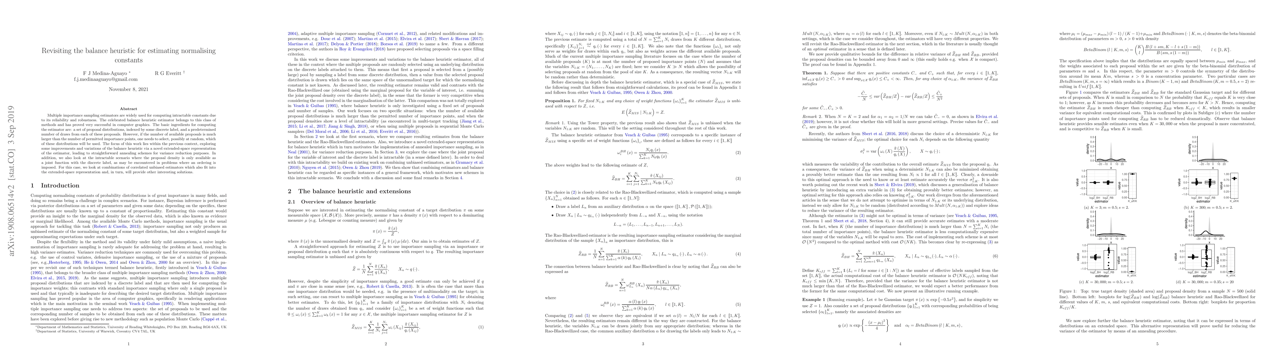 Multiple importance sampling estimators are widely used for computing intractable constants due to its reliability and robustness. The celebrated balance heuristic estimator belongs to this class of methods and has proved very successful in computer graphics. The basic ingredients for computing the estimator are: a set of proposal distributions, indexed by some discrete label, and a predetermined number of draws from each of these proposals. However, if the number of available proposals is much larger than the number of permitted importance points, one needs to select, possibly at random, which of these distributions will be used. The focus of this work lies within the previous context, exploring some improvements and variations of the balance heuristic via a novel extended-space representation of the estimator, leading to straightforward annealing schemes for variance reduction purposes. In addition, we also look at the intractable scenario where the proposal density is only available as a joint function with the discrete label, as may be encountered in problems where an ordering is imposed. For this case, we look at combinations of correlated unbiased estimators which also fit into the extended-space representation and, in turn, will provide other interesting solutions.