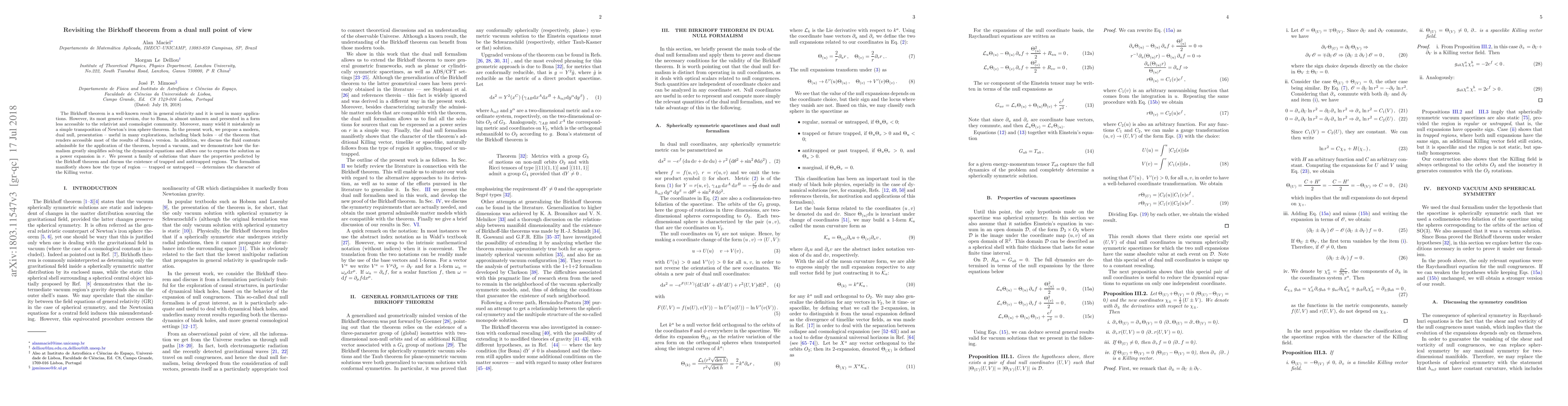 The Birkhoff theorem is a well-known result in general relativity and it is used in many applications. However, its most general version, due to Bona, is almost unknown and presented in a form less accessible to the relativist and cosmologist community. Moreover, many wield it mistakenly as a simple transposition of Newton's iron sphere theorem. In the present work, we propose a modern, dual null, presentation --- useful in many explorations, including black holes --- of the theorem that renders accessible most of the results of Bona's version. In addition, we discuss the fluid contents admissible for the application of the theorem, beyond a vacuum, and we demonstrate how the formalism greatly simplifies solving the dynamical equations and allows one to express the solution as a power expansion in $r$. We present a family of solutions that share the properties predicted by the Birkhoff theorem and discuss the existence of trapped and antitrapped regions. The formalism manifestly shows how the type of region --- trapped or untrapped --- determines the character of the Killing vector.