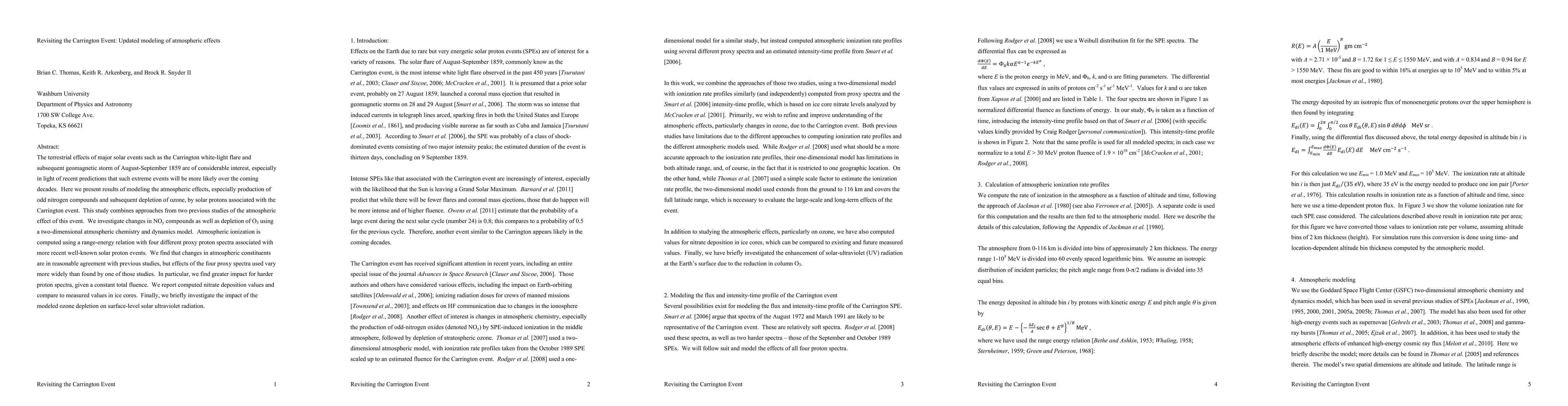 The terrestrial effects of major solar events such as the Carrington white-light flare and subsequent geomagnetic storm of August-September 1859 are of considerable interest, especially in light of recent predictions that such extreme events will be more likely over the coming decades. Here we present results of modeling the atmospheric effects, especially production of odd nitrogen compounds and subsequent depletion of ozone, by solar protons associated with the Carrington event. This study combines approaches from two previous studies of the atmospheric effect of this event. We investigate changes in NOy compounds as well as depletion of O3 using a two-dimensional atmospheric chemistry and dynamics model. Atmospheric ionization is computed using a range-energy relation with four different proxy proton spectra associated with more recent well-known solar proton events. We find that changes in atmospheric constituents are in reasonable agreement with previous studies, but effects of the four proxy spectra used vary more widely than found by one of those studies. In particular, we find greater impact for harder proton spectra, given a constant total fluence. We report computed nitrate deposition values and compare to measured values in ice cores. Finally, we briefly investigate the impact of the modeled ozone depletion on surface-level solar ultraviolet radiation.