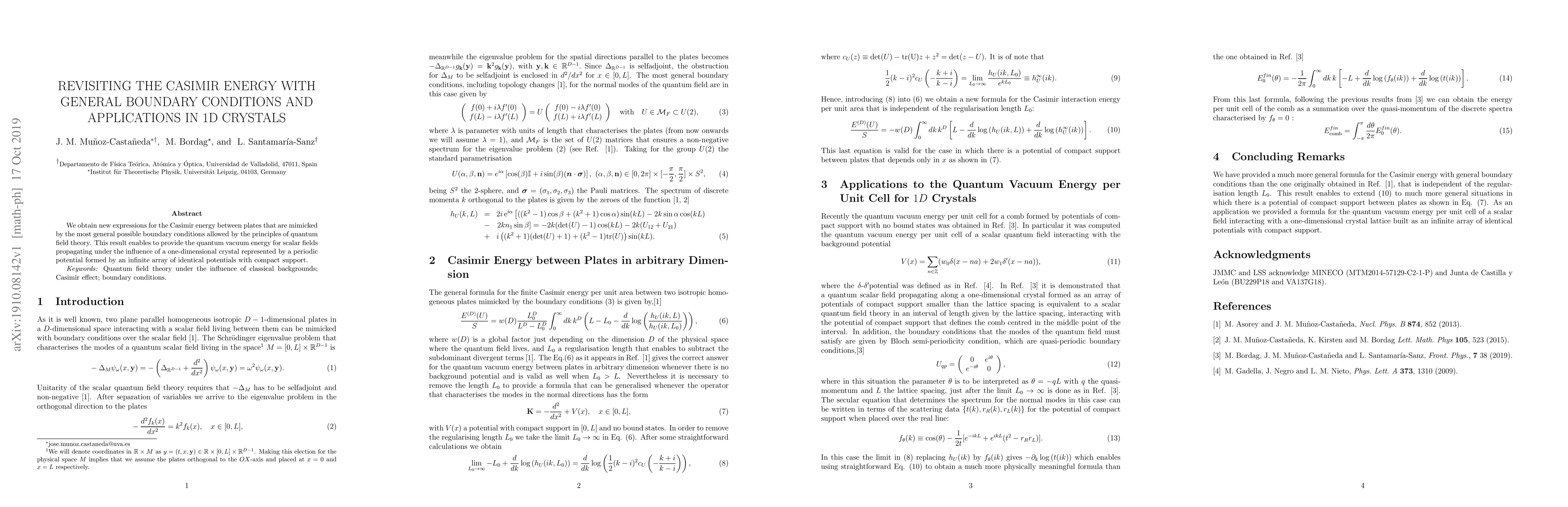 This paper derives new expressions for the Casimir energy under general boundary conditions, facilitating the calculation of quantum vacuum energy for scalar fields in one-dimensional crystals with periodic potentials. The findings extend the understanding of vacuum energy in quantum field theory.